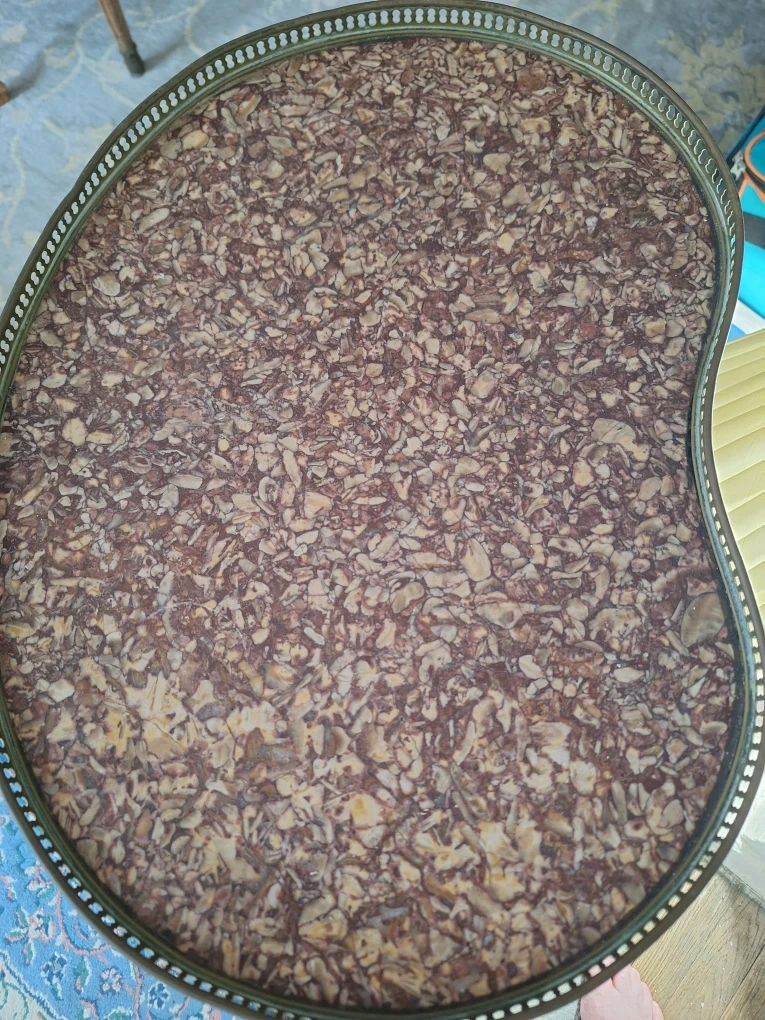 Selling a charming vintage-style wood side table. It features a beautiful wood grain finish, three drawers, and ornate metal accents. A lovely addition to any room!