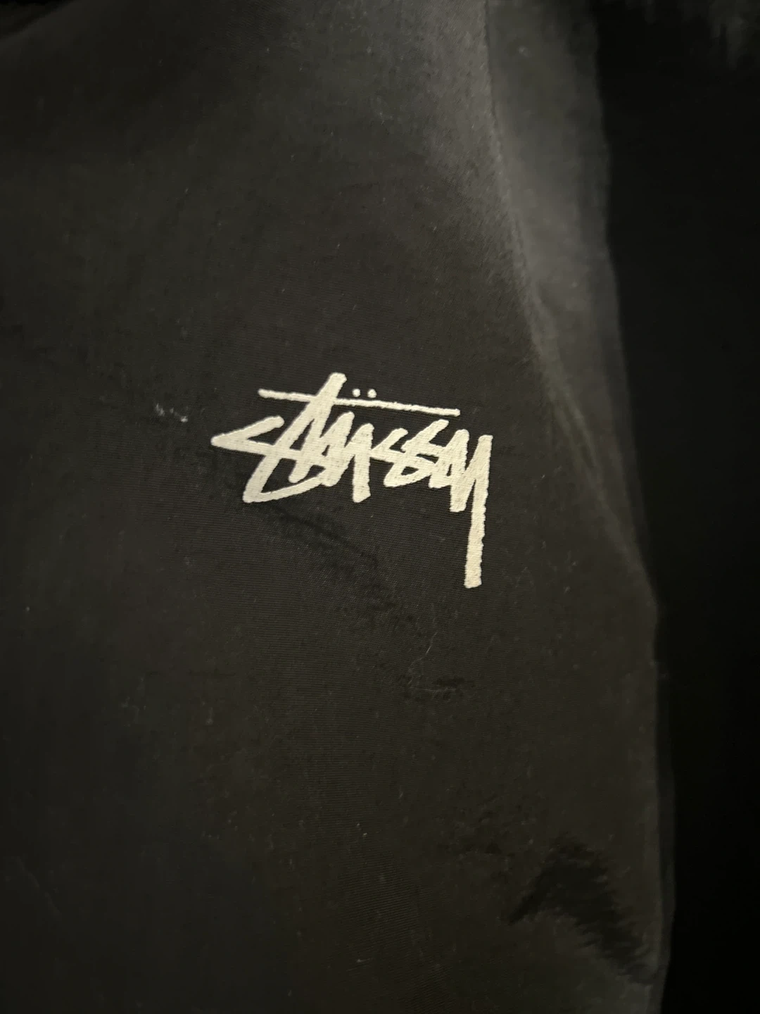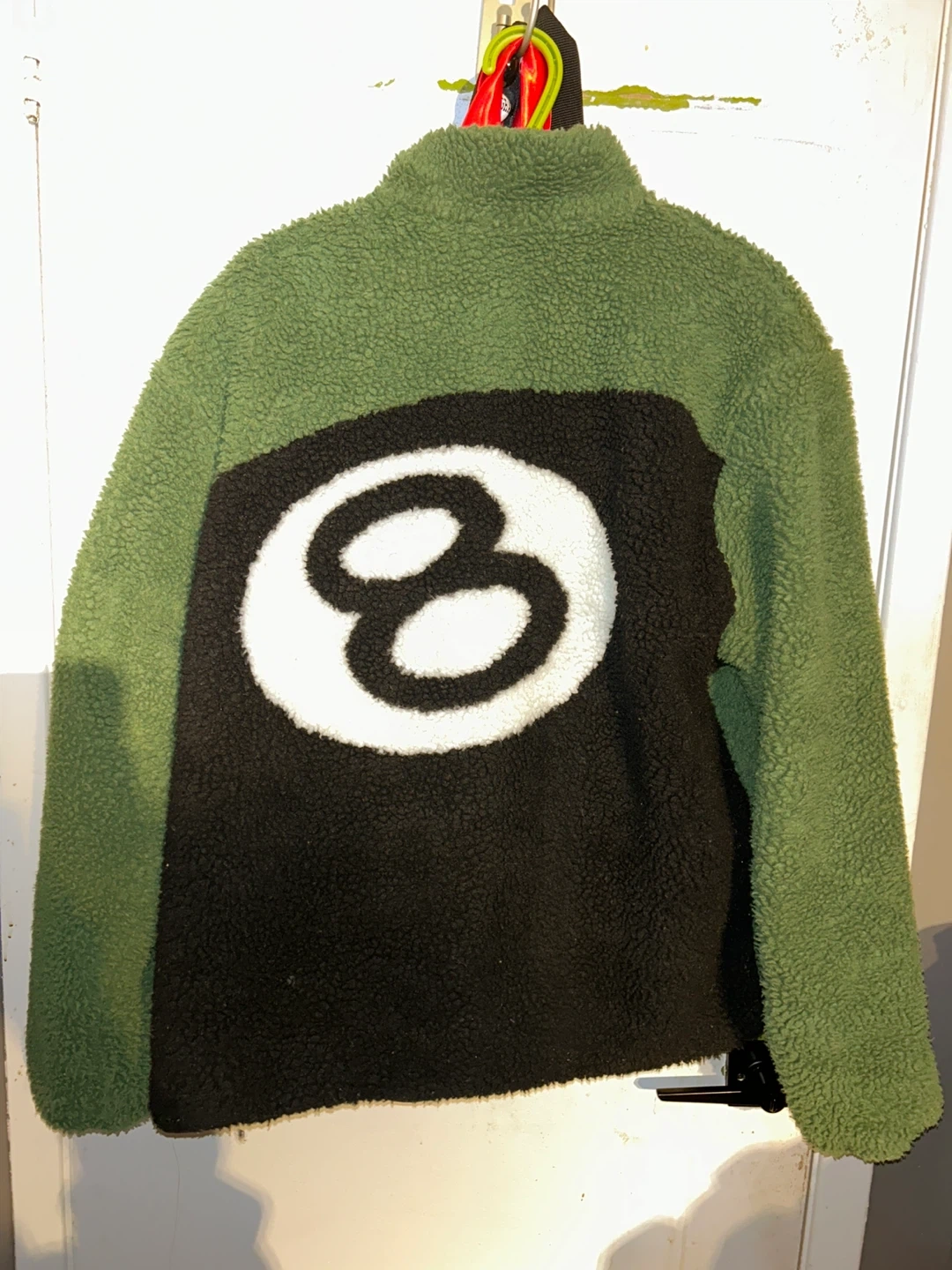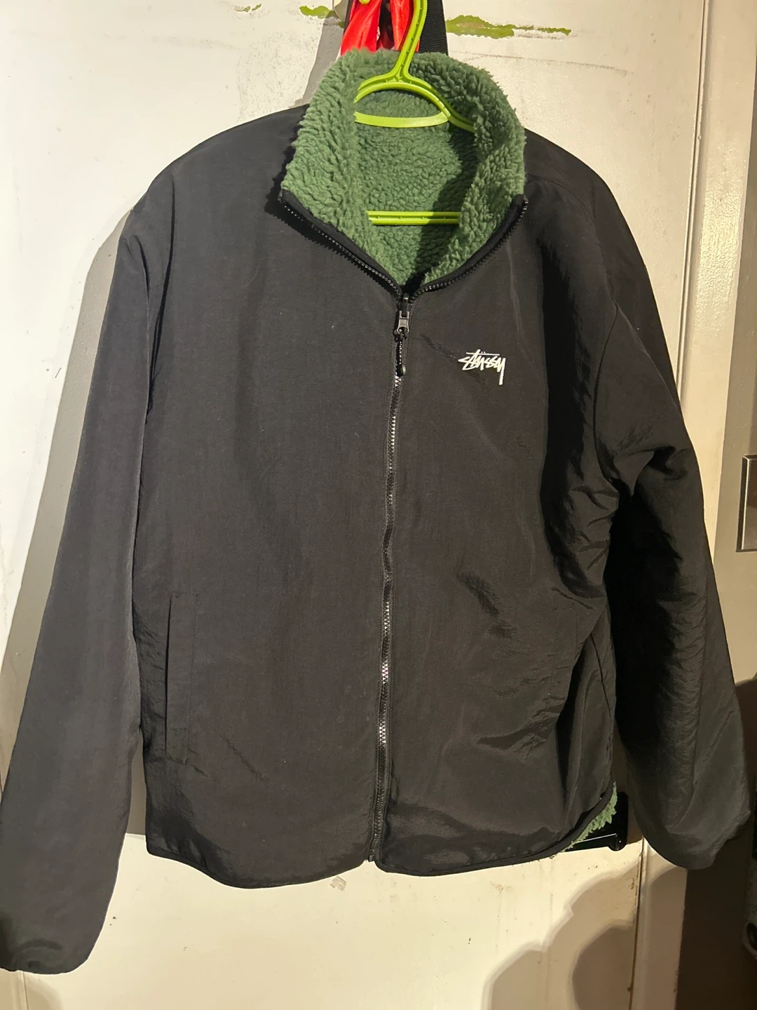 This Stüssy jacket reverses from a black nylon to a fuzzy green sherpa. It features the iconic Stüssy logo on the black side and a large "8 ball" graphic on the green side. Zipper closure and pockets keep your essentials secure. It's a great piece for staying warm and stylish!
