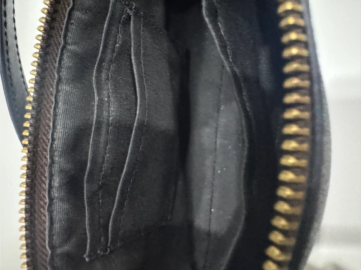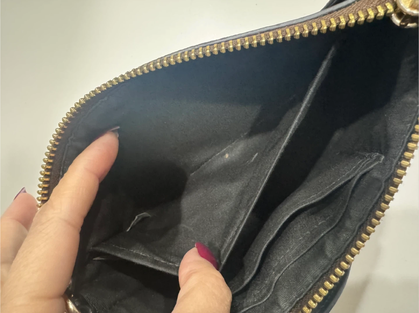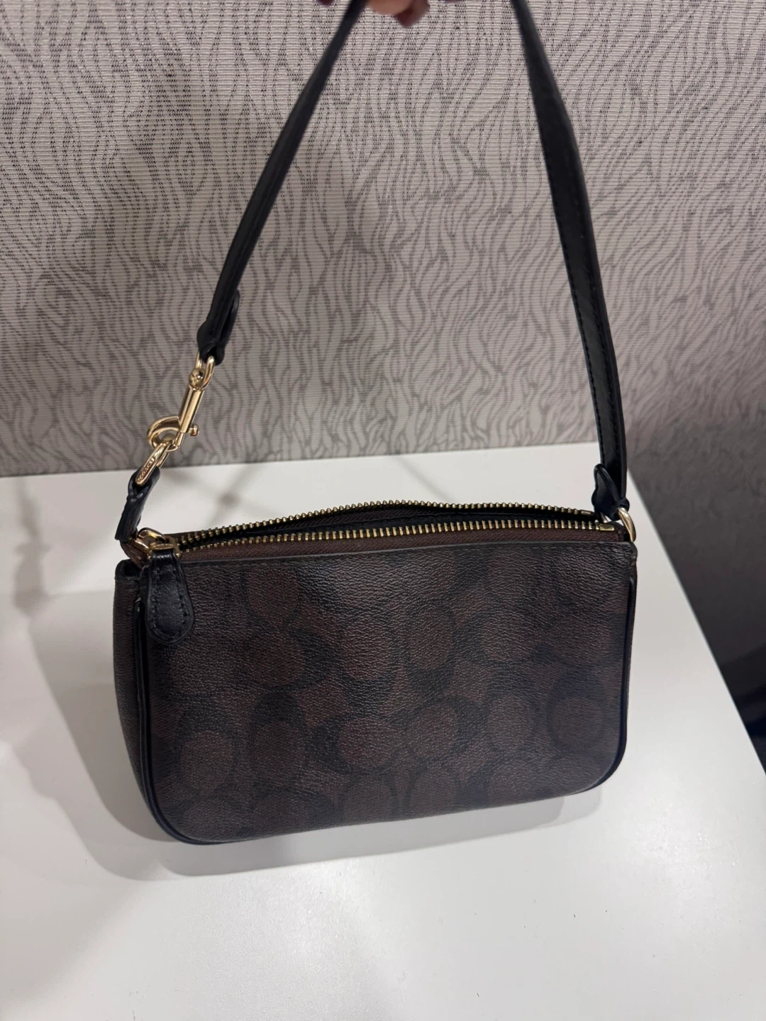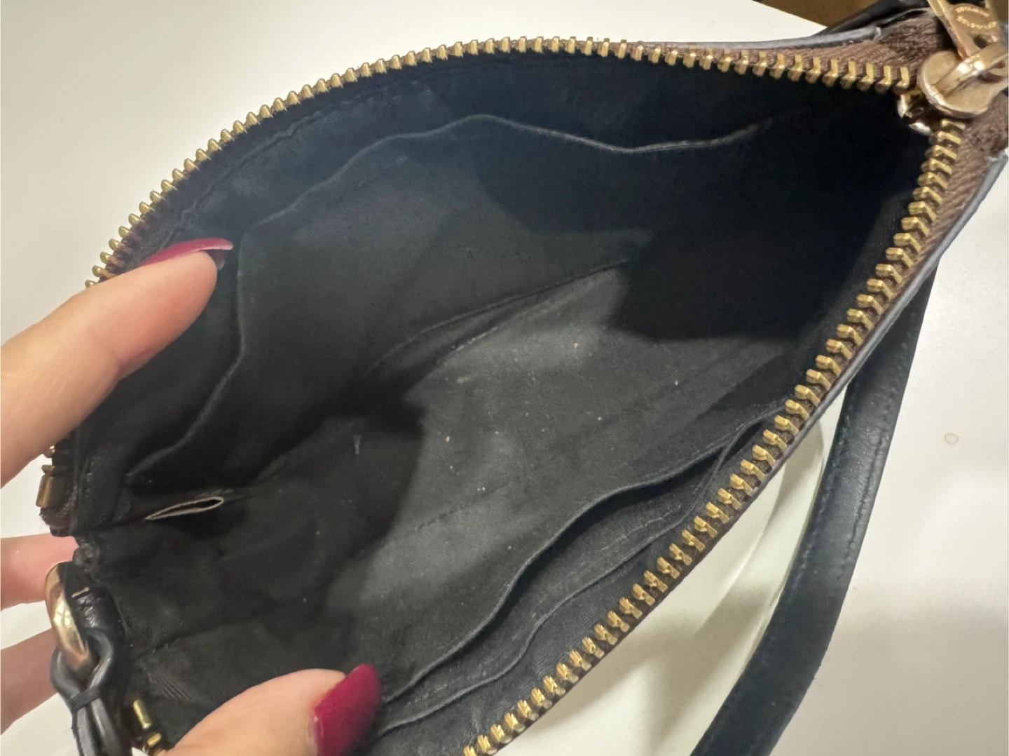 This is a Coach wristlet pouch with a signature C pattern. It's brown with gold hardware and includes multiple card slots inside. Perfect for carrying essentials on the go!