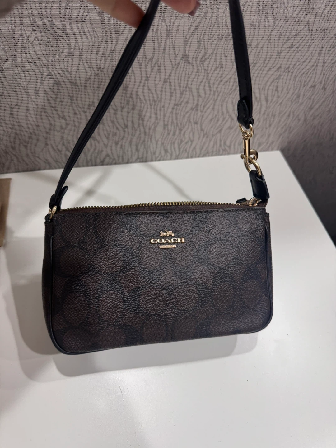 This is a Coach wristlet pouch with a signature C pattern. It's brown with gold hardware and includes multiple card slots inside. Perfect for carrying essentials on the go!