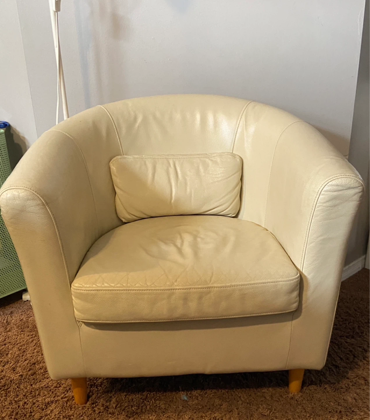 A comfortable accent chair upholstered in cream-coloured leather. It features a rounded back and includes a small matching cushion. Wooden legs support the chair.