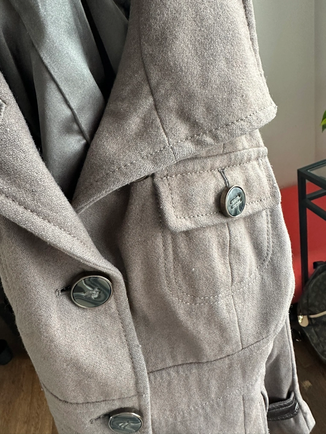 The coat has a belted waist.