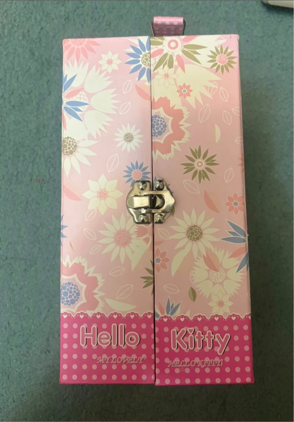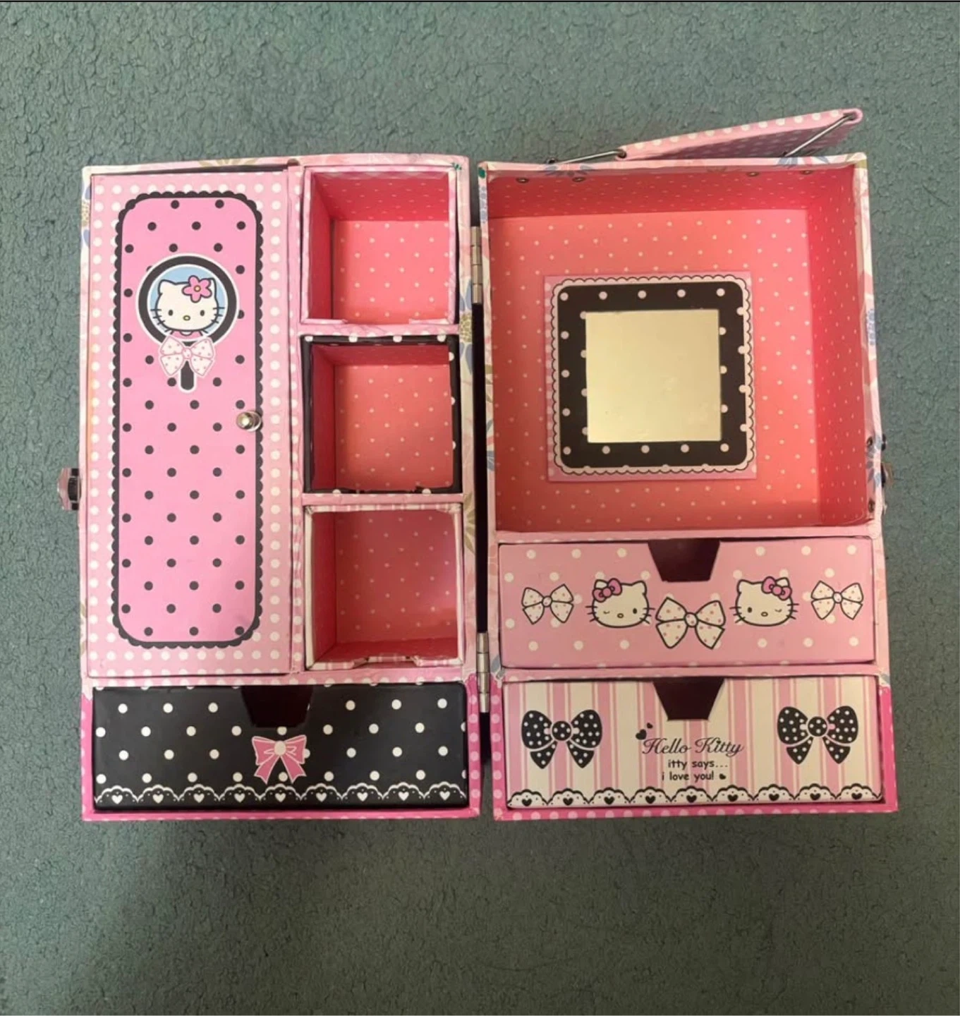 This is a Hello Kitty jewellery box. It has multiple compartments and drawers for storage. Inside, there's also a mirror.