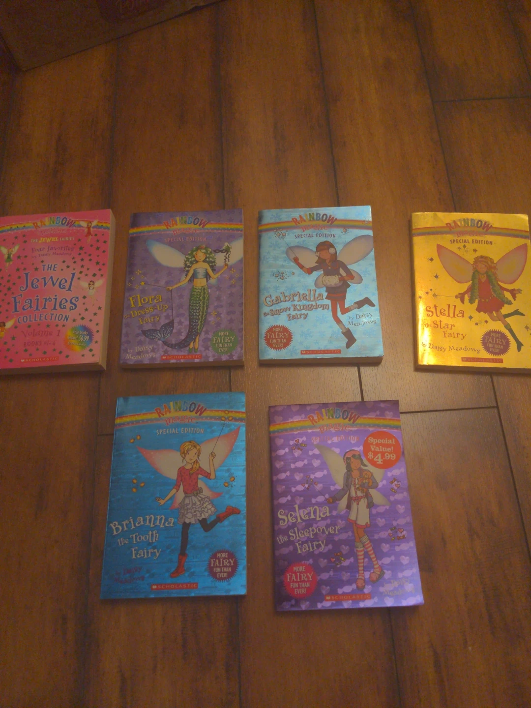 This lot includes five Rainbow Magic Special Edition fairy books by Daisy Meadows. Titles are The Jewel Fairies, Flora the Fairy, Gabriella the Snow Kingdom Fairy, Stella the Star Fairy, Brianna the Tooth Fairy, and Selena the Sleepover Fairy. These books are published by Scholastic.