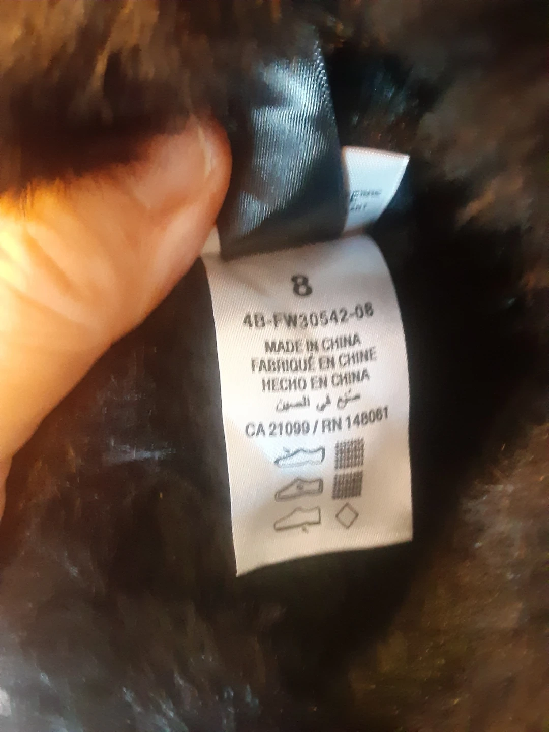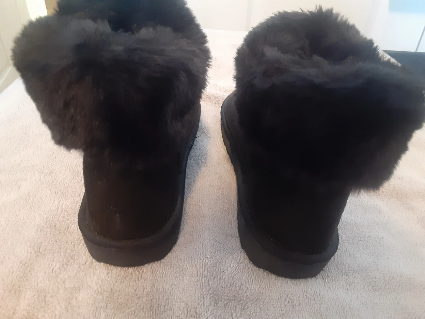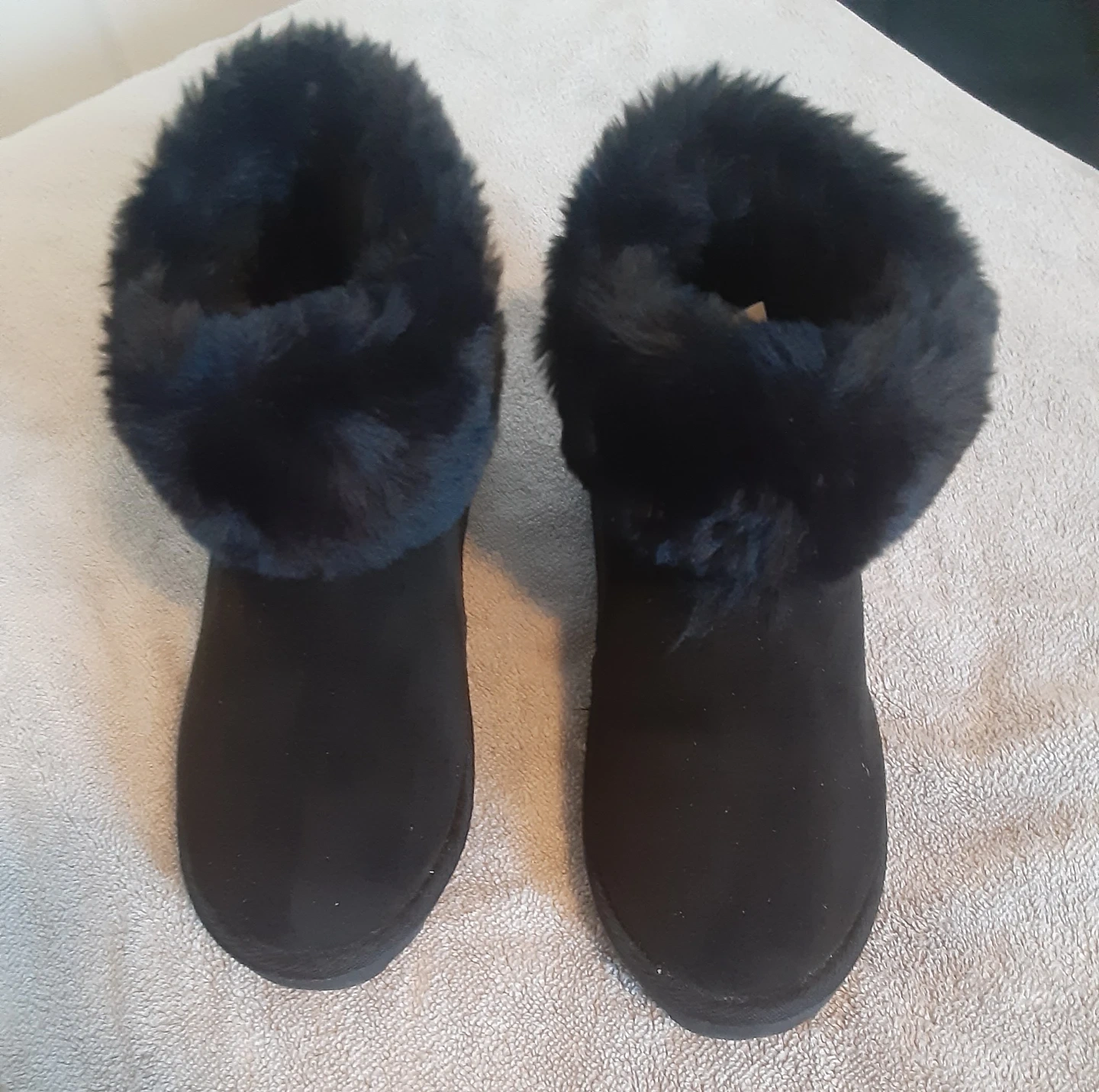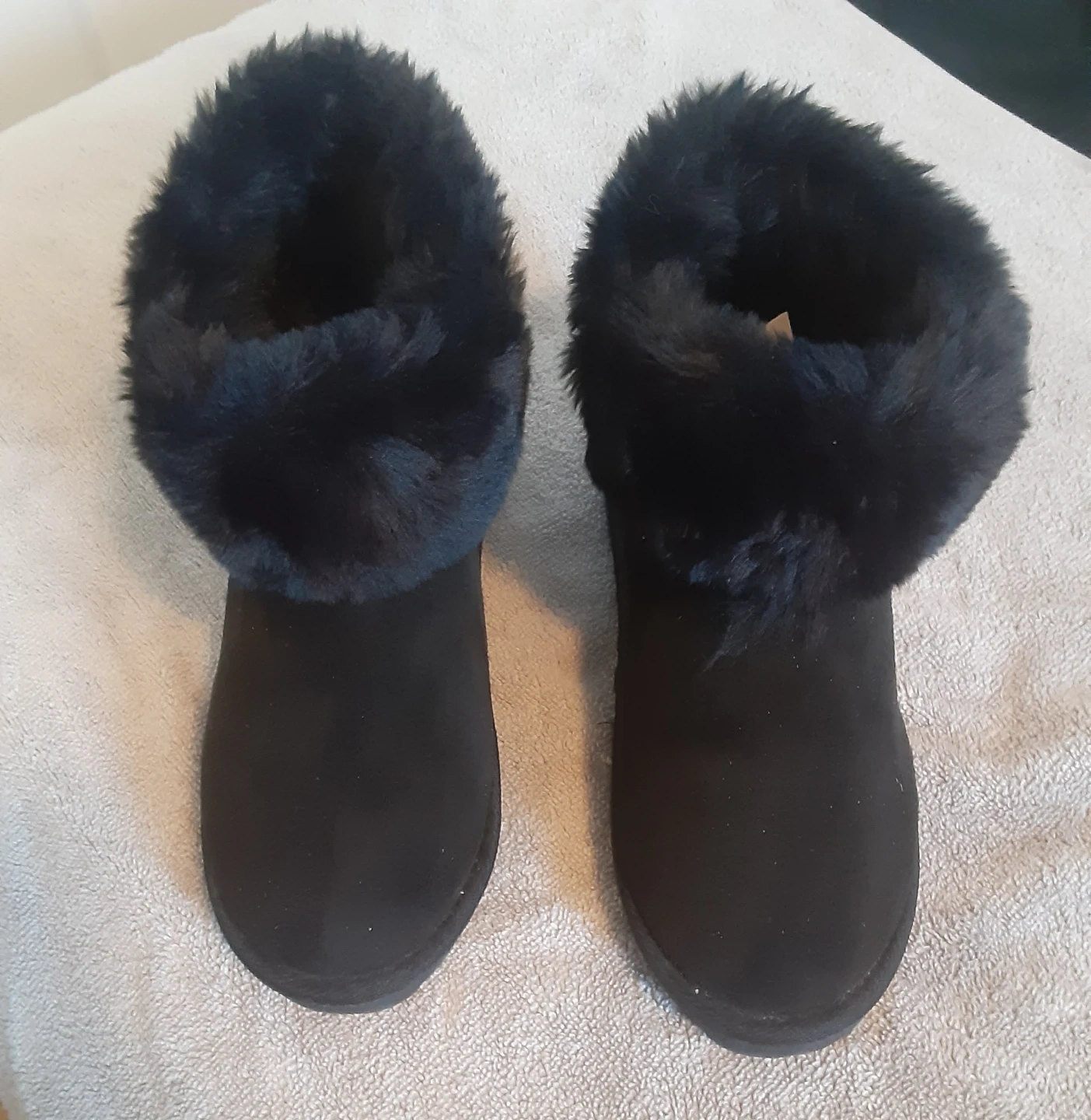 Comfortable black boots with a soft fur trim. They're a size 8 and made with a suede-like material. The sole has a good grip pattern.