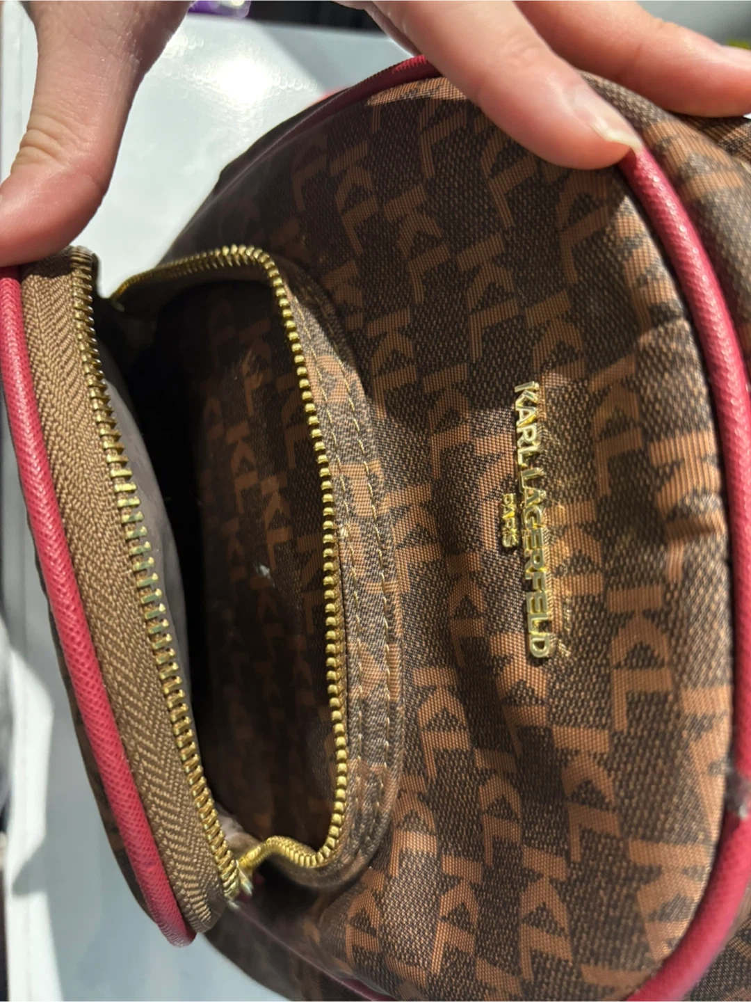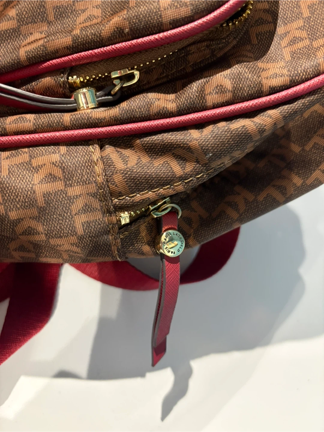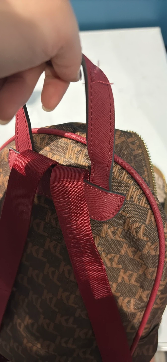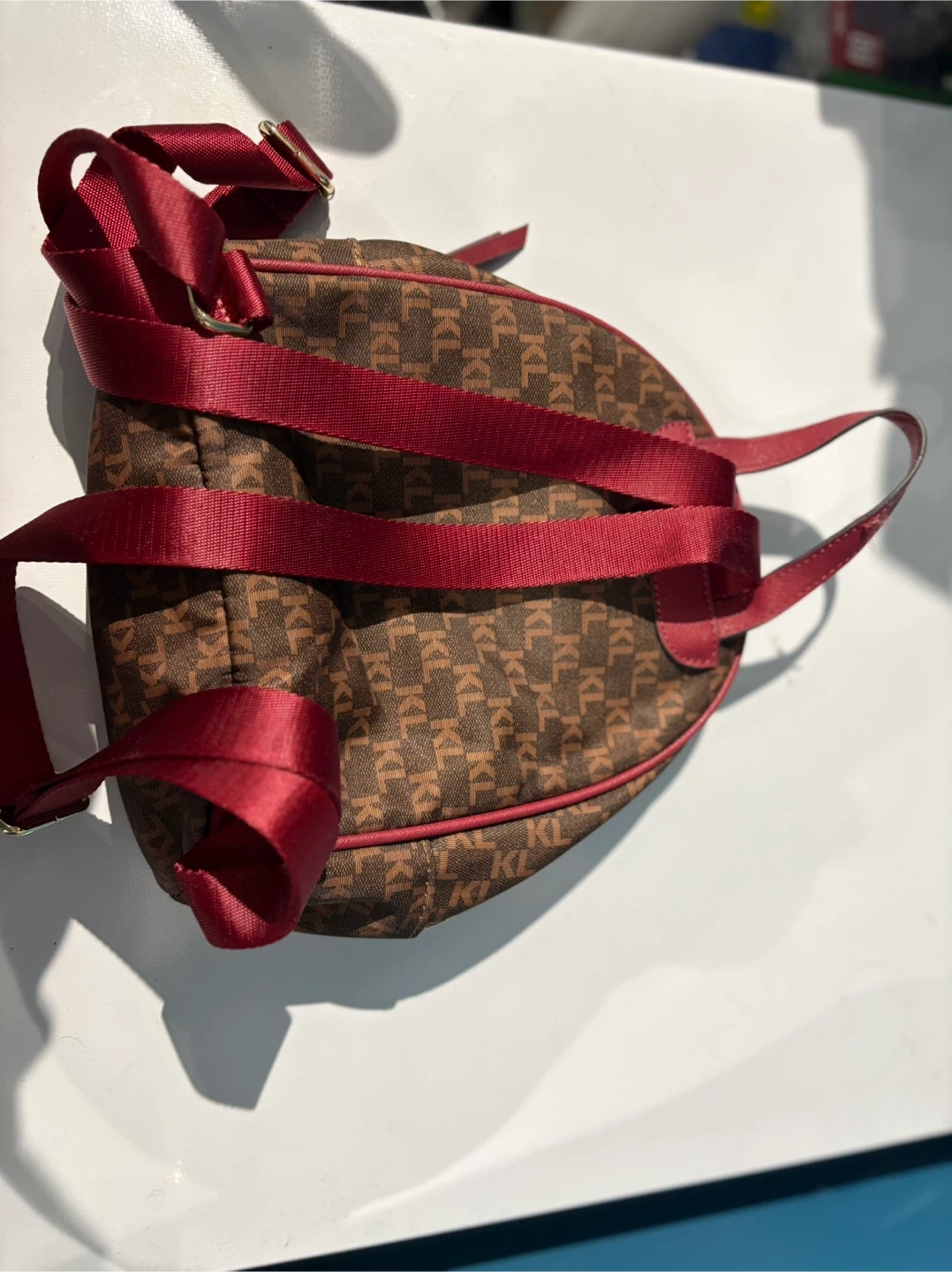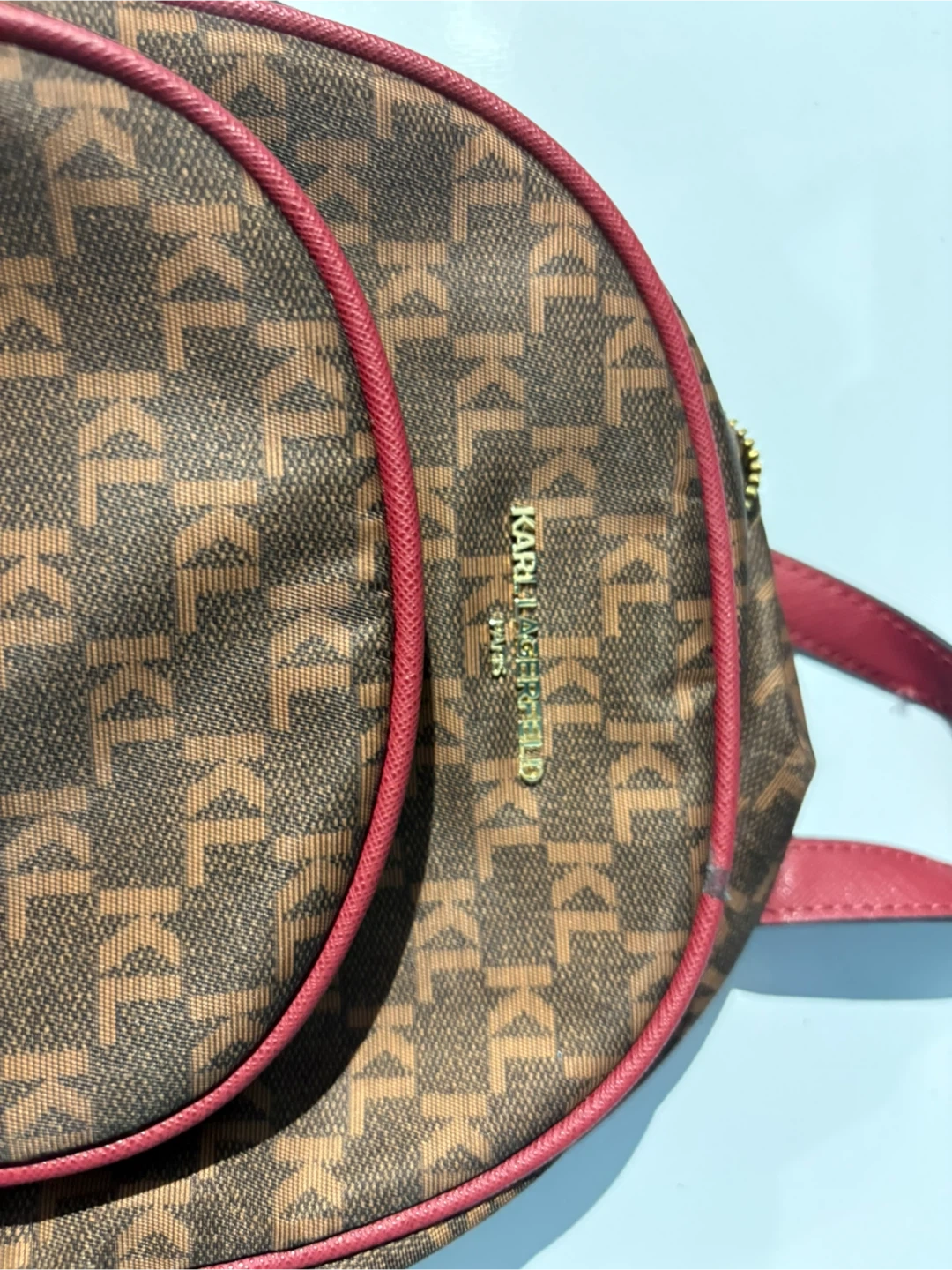 A stylish Karl Lagerfeld Paris backpack in a brown signature KL print. It features red trim and adjustable straps. Interior includes a zippered pocket.