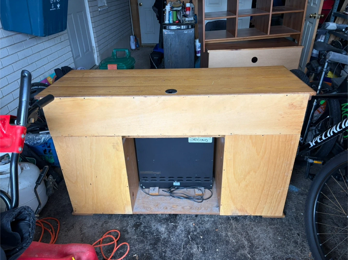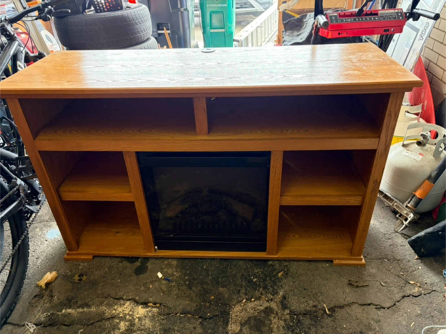 This is a solid wood entertainment stand with an integrated electric fireplace. It offers plenty of storage space with multiple shelves on either side. Great for a living room or bedroom setup!
