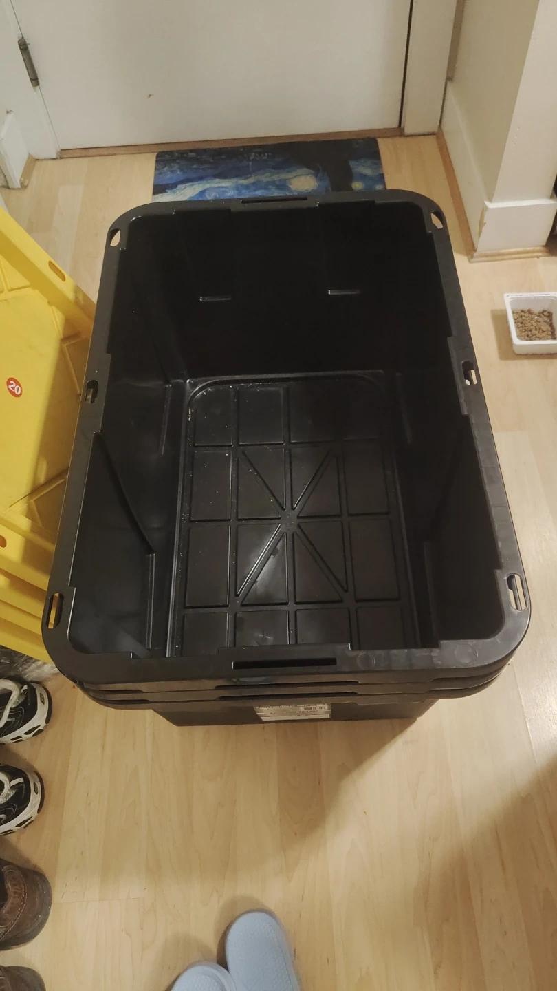 Greenmade professional grade storage tote bin with a lid. This 30-gallon bin is built tough to last and is made from 100% recycled plastic. It's NSF certified for food safety. Perfect for organizing garages, basements, or even for moving.