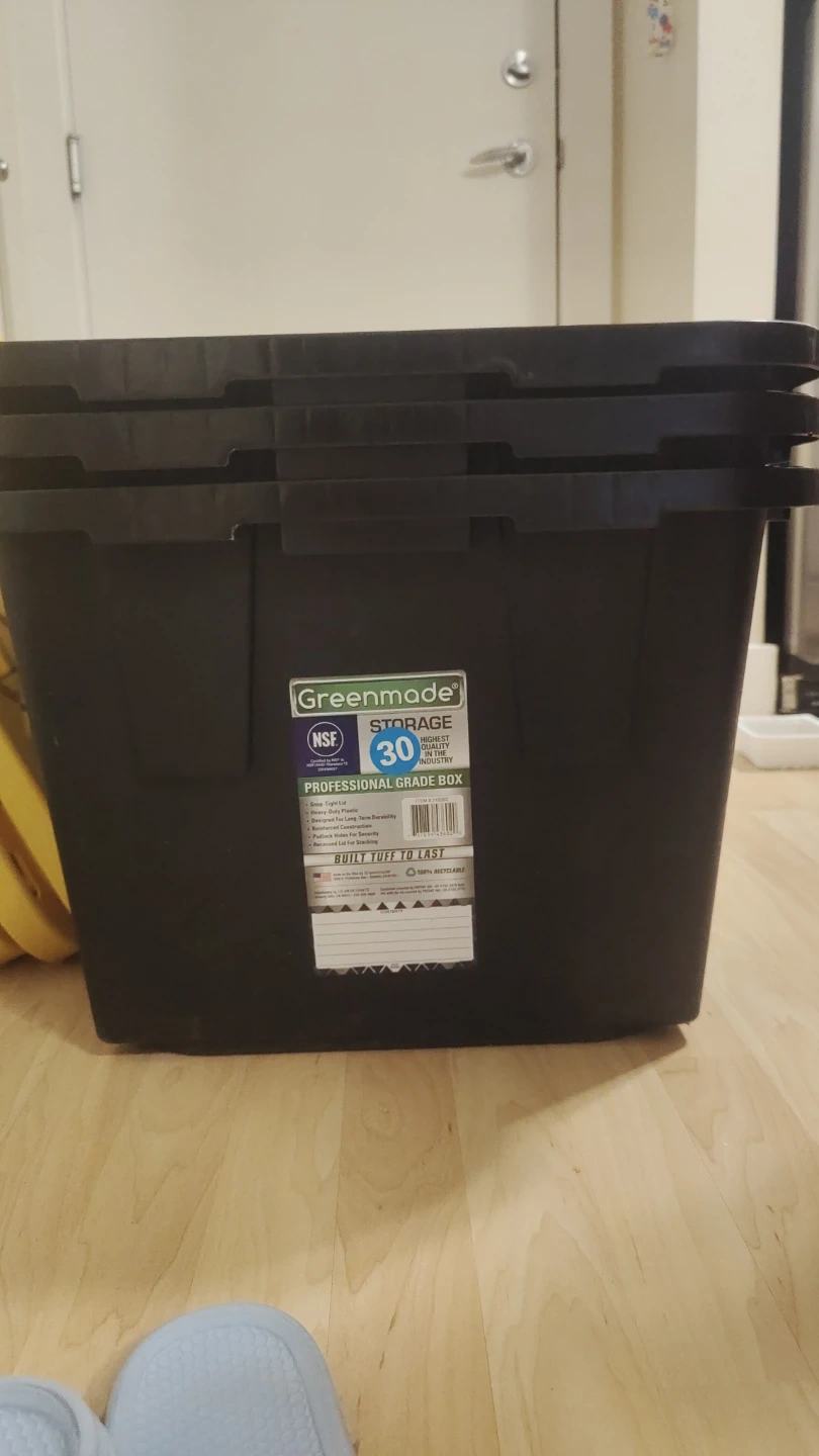 Greenmade professional grade storage tote bin with a lid. This 30-gallon bin is built tough to last and is made from 100% recycled plastic. It's NSF certified for food safety. Perfect for organizing garages, basements, or even for moving.