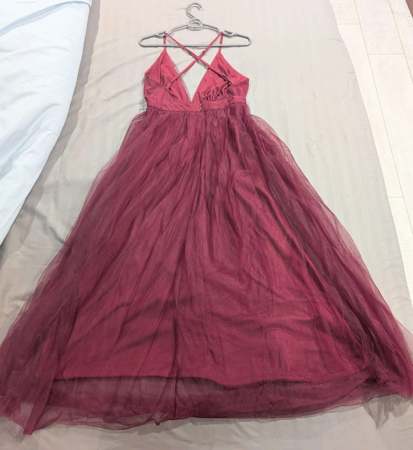 gown features a deep V-neckline and criss-cross spaghetti straps. It's made of a shimmering burgundy satin-like material with a flowing tulle overlay. Size S (US 4).