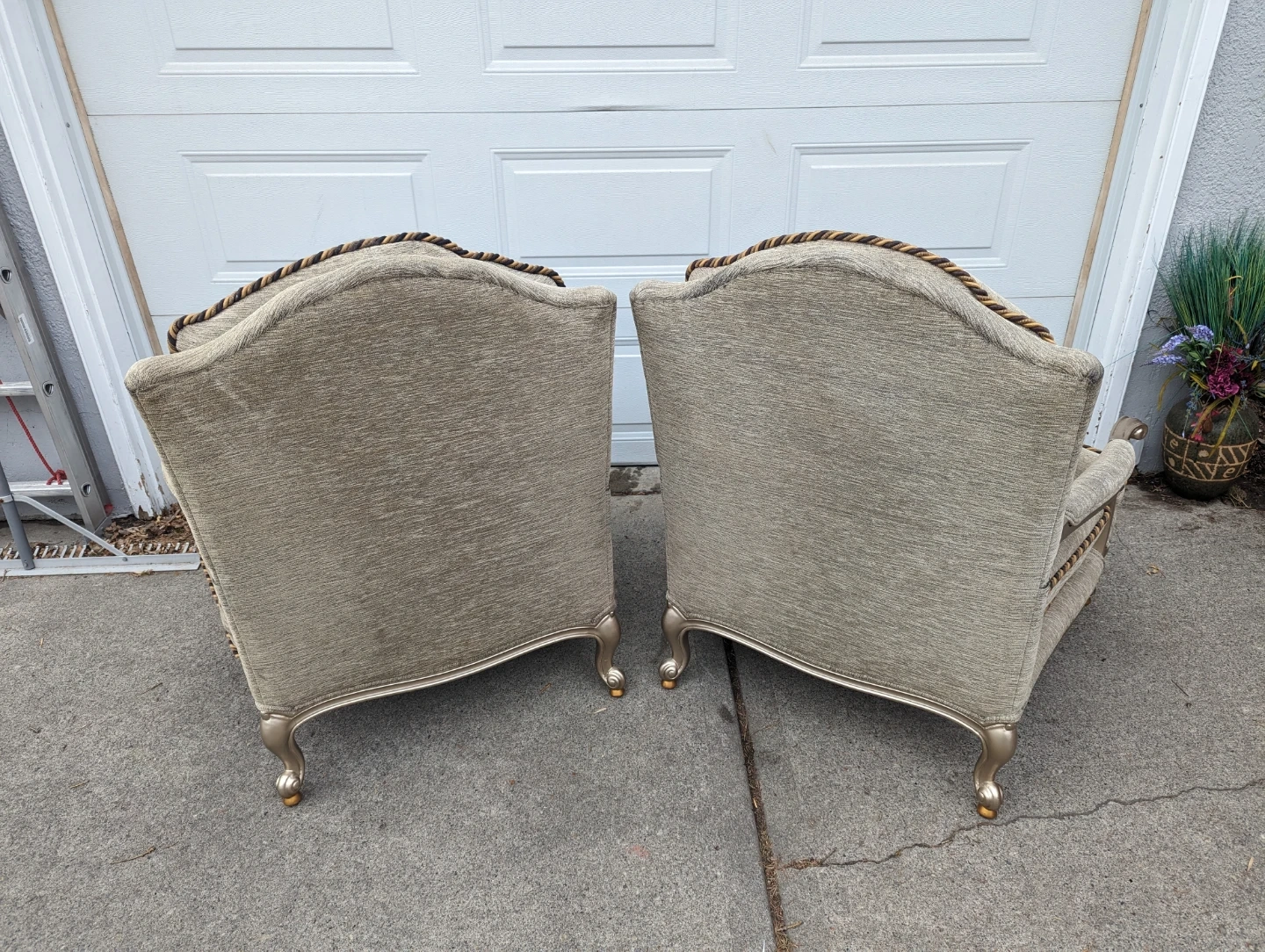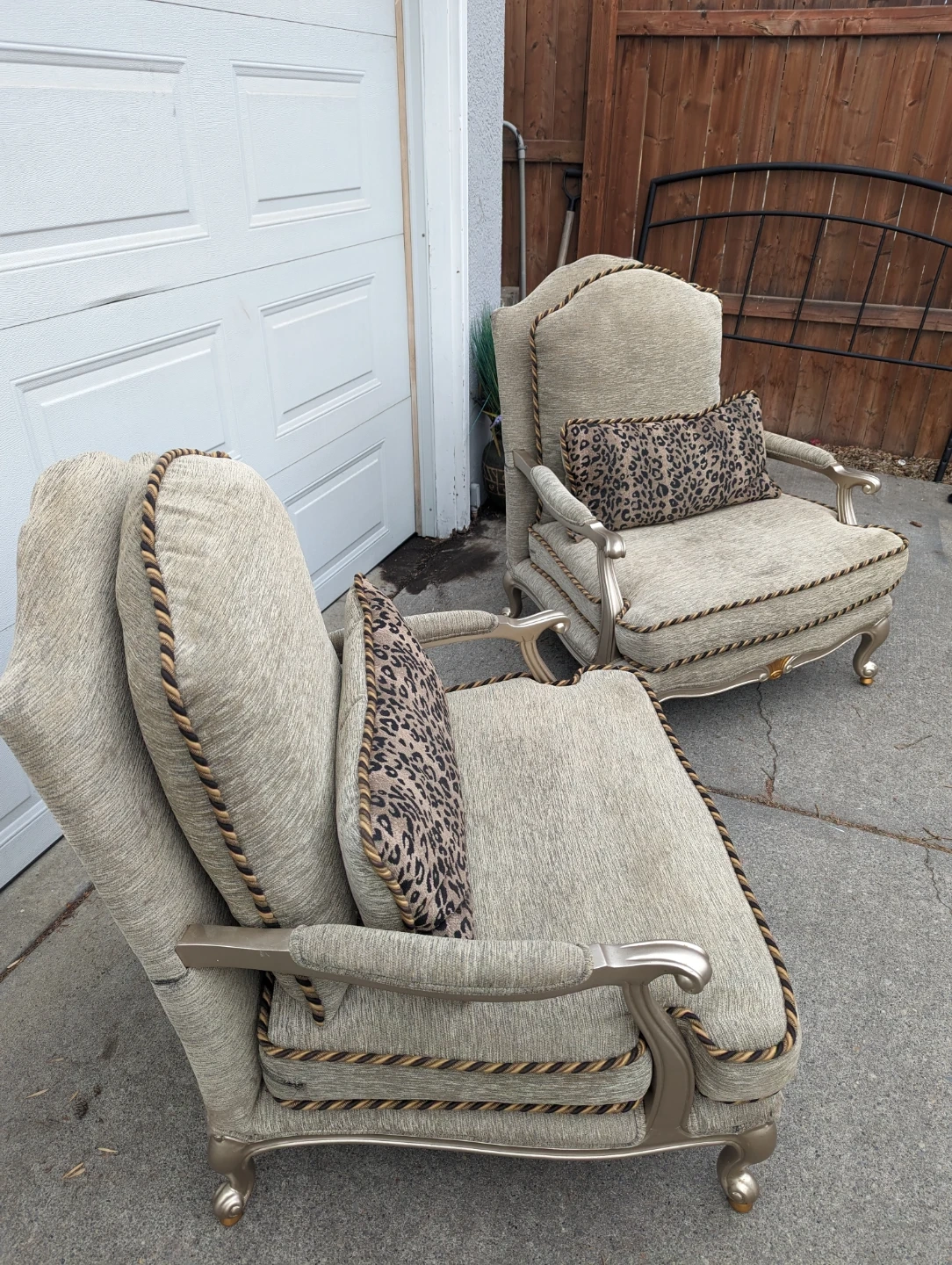 A pair of elegant accent chairs upholstered in a textured light gold fabric. They feature ornate trim and come with decorative pillows, including one with a leopard print. These chairs would add a touch of style to any living space.