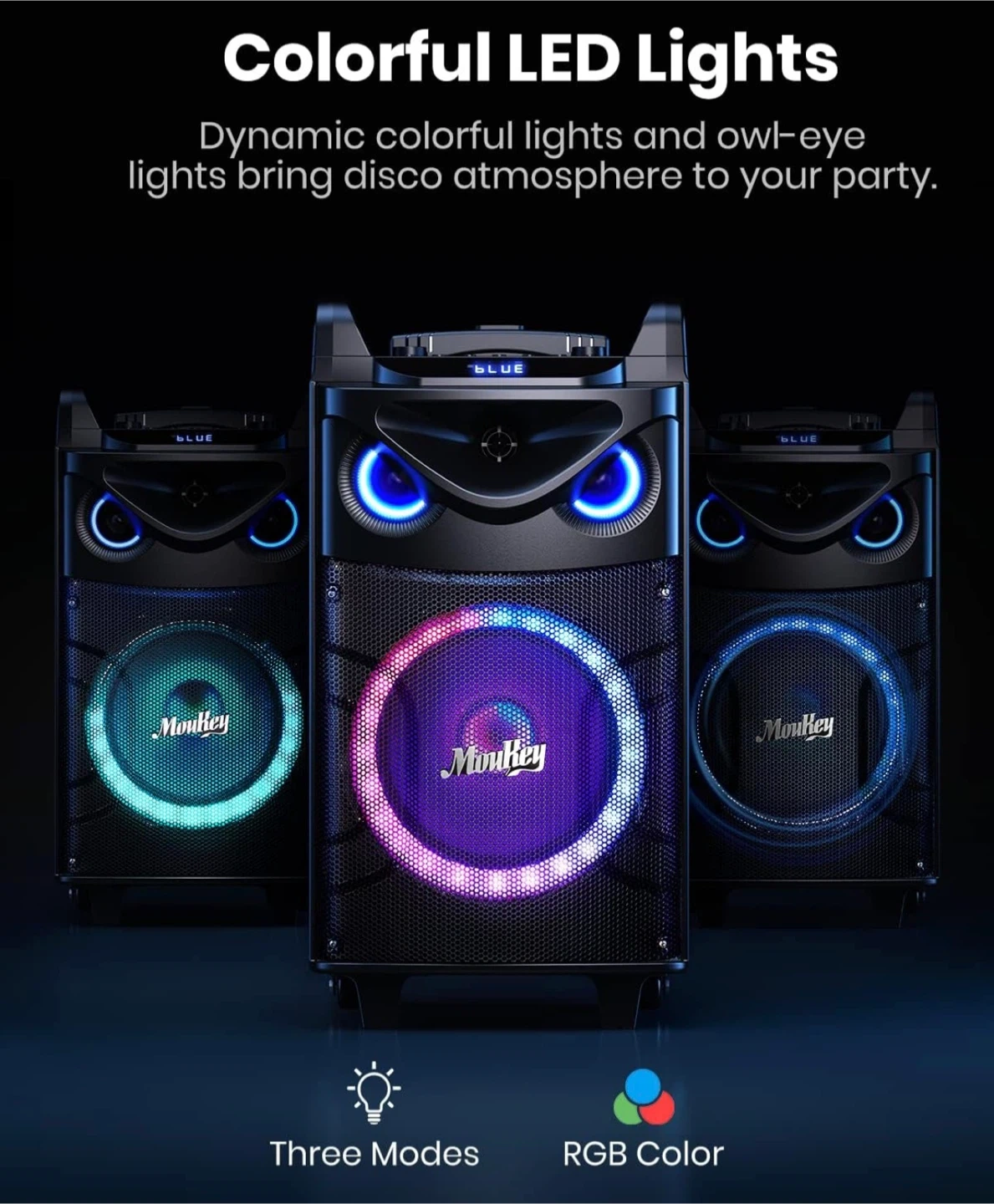 This Monkey portable speaker features dynamic colorful lights and owl-eye lighting to create a disco atmosphere. It offers three modes and RGB color options for a customizable party experience.