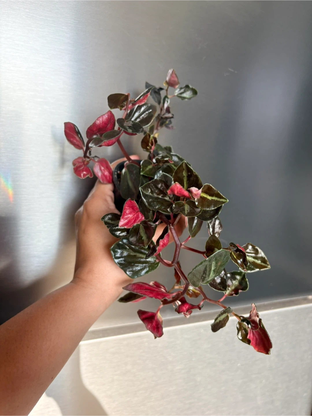 A vibrant Peperomia Metallica plant with striking red and green foliage. It's a beautiful addition to any indoor space. This plant thrives in bright, indirect light and prefers well-draining soil.