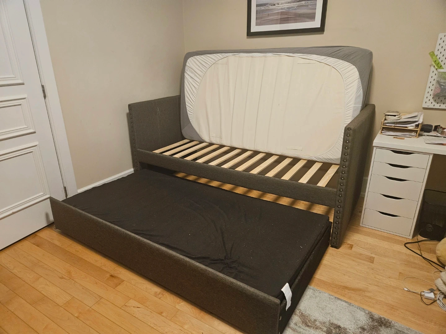 Gray daybed with a trundle hidden other bed.