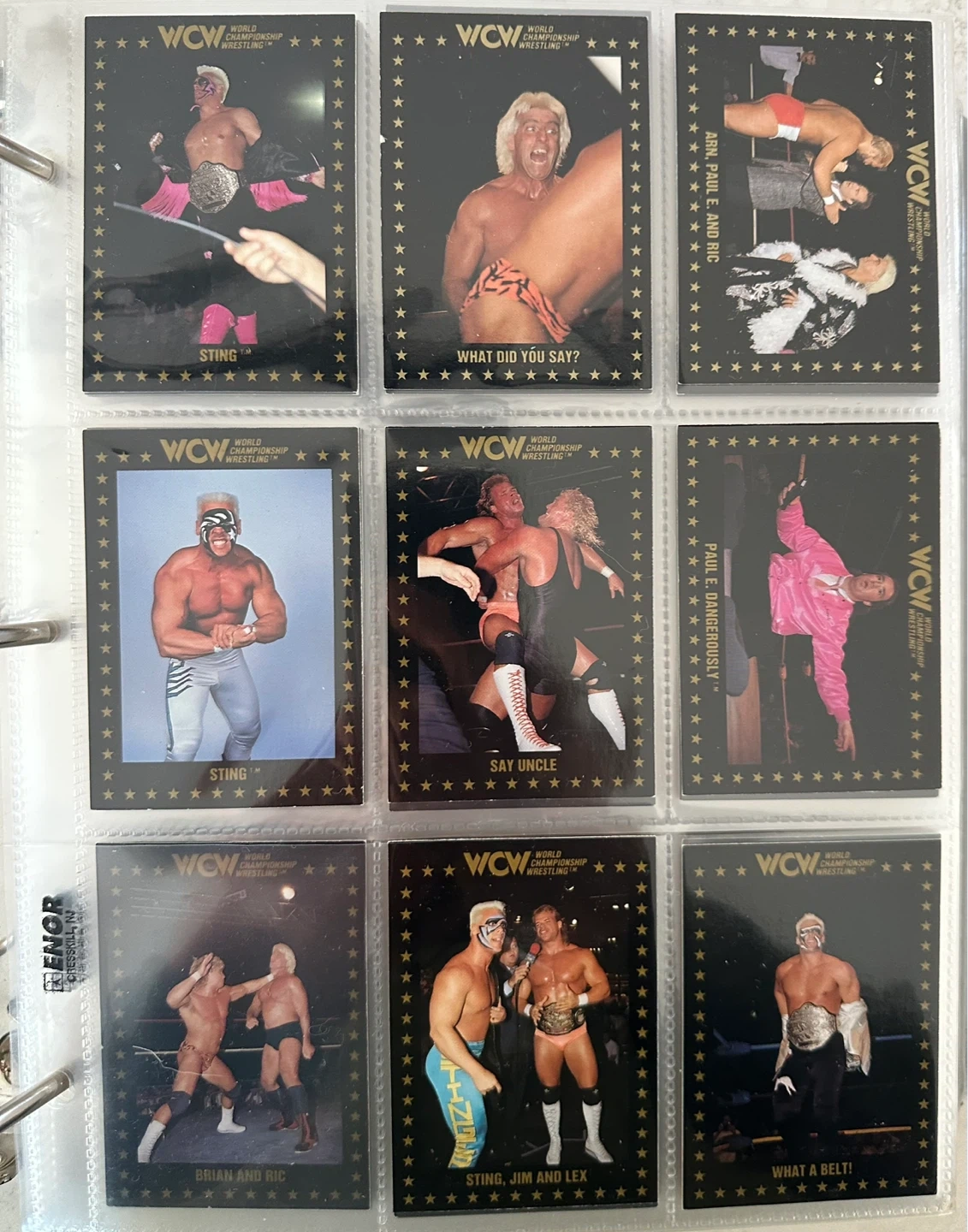 Almost complete set of the 1991 WCW World Championship Marketing Wrestling Trading . Cards. It includes cards of all the WCW stars like Sting, Ric Flair, and Lex Luger. Each card showcases different wrestling moments and promotions. These cards are perfect for wrestling fans and collectors.