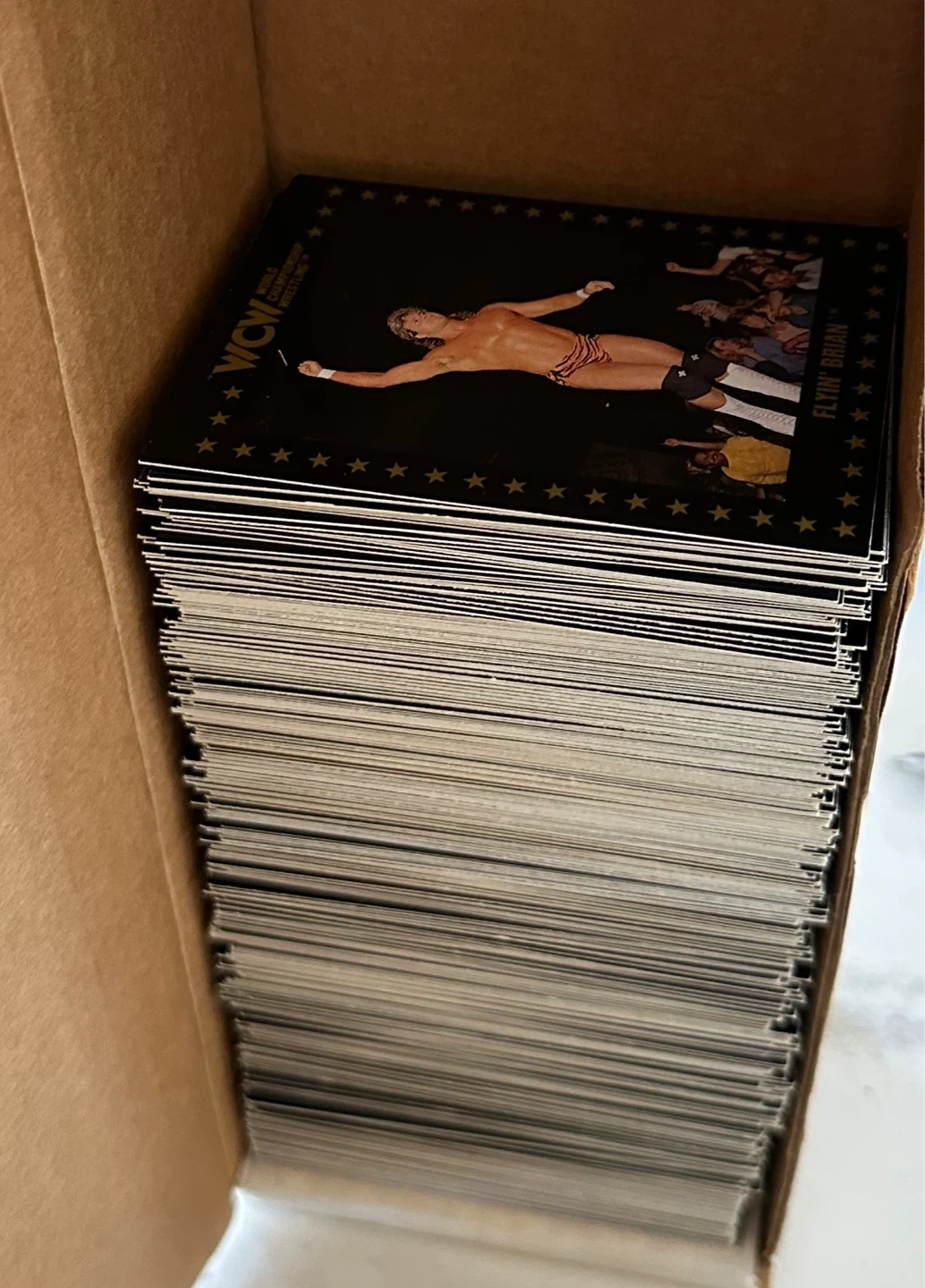 Almost complete set of the 1991 WCW World Championship Marketing Wrestling Trading . Cards. It includes cards of all the WCW stars like Sting, Ric Flair, and Lex Luger. Each card showcases different wrestling moments and promotions. These cards are perfect for wrestling fans and collectors.