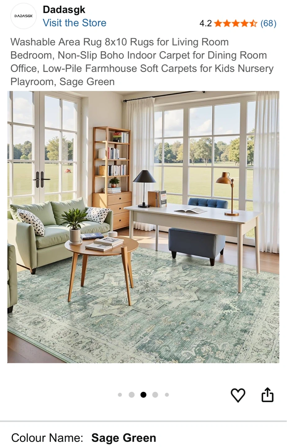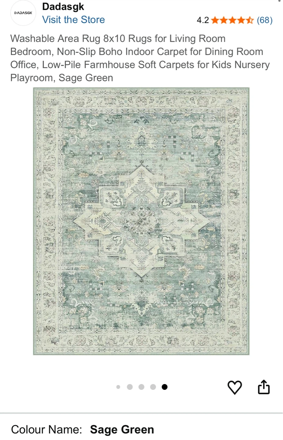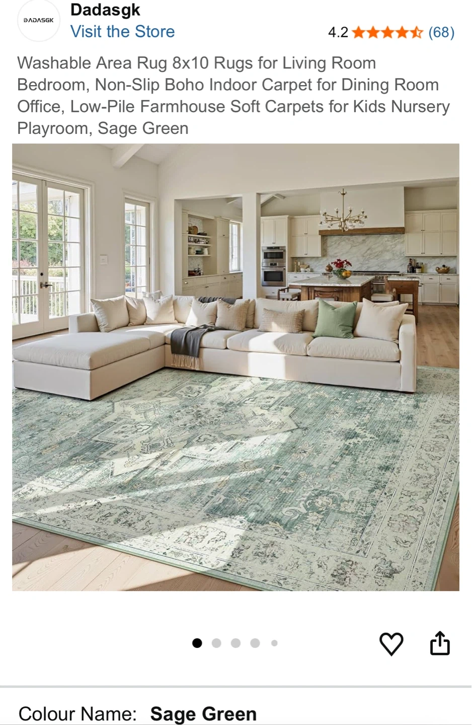 This washable area rug is 8x10 and comes in a sage green colour. It's low-pile and suitable for various rooms. Pet and kids friendly!