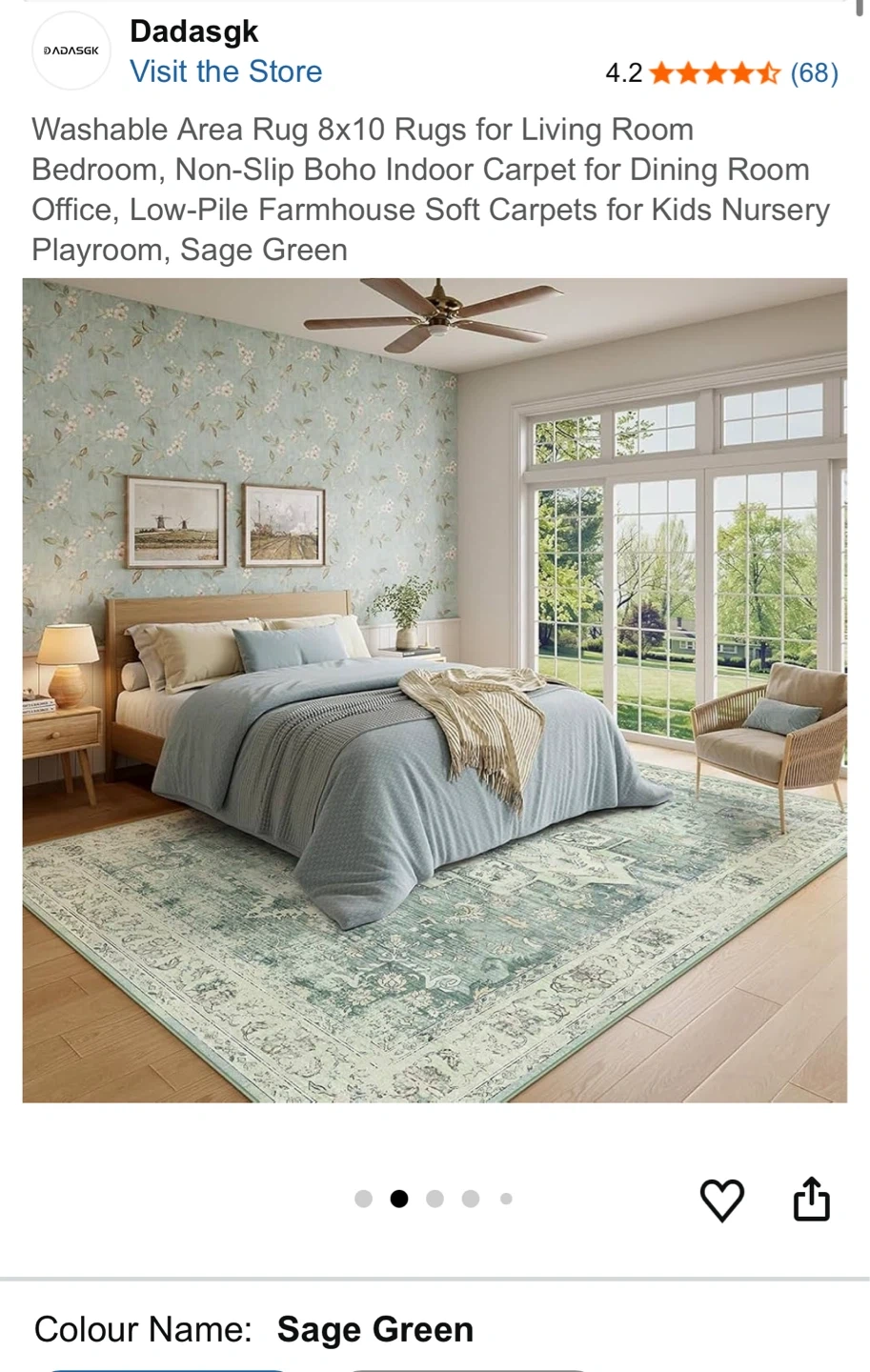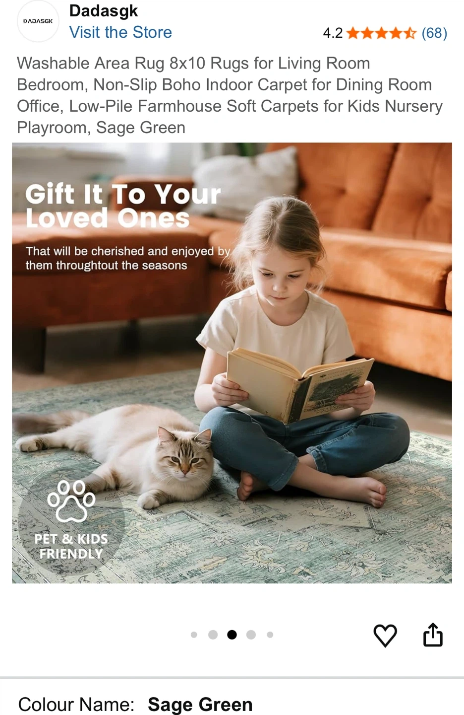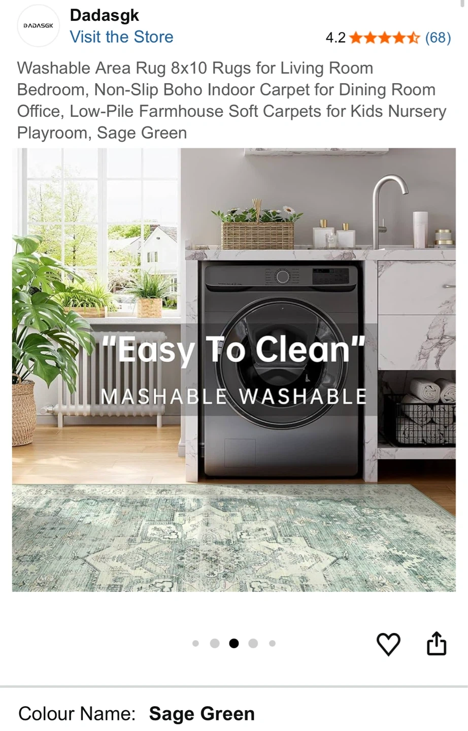 This washable area rug is 8x10 and comes in a sage green colour. It's low-pile and suitable for various rooms. Pet and kids friendly!