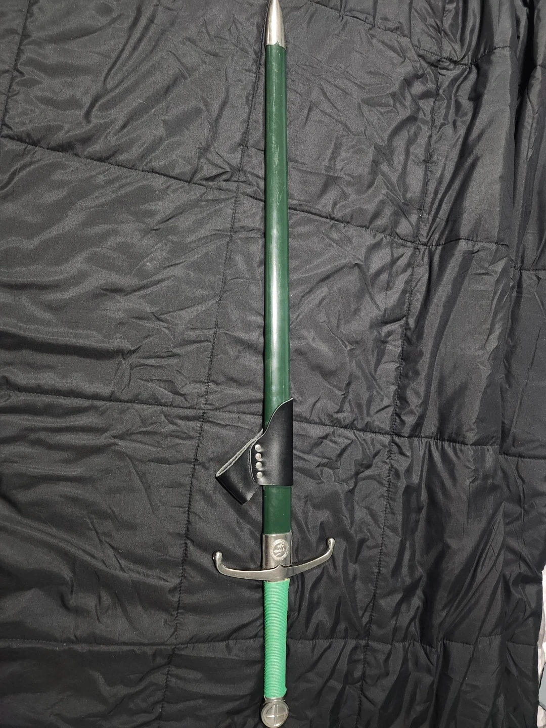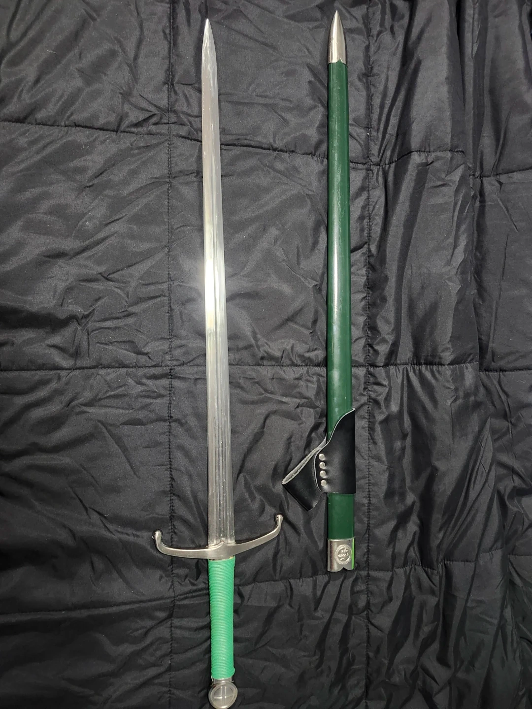 This is a real steel sharpened longsword with a green scabbard. The hilt is wrapped in green cord and features a silver-toned pommel. It includes a green scabbard with a black leather frog for carrying.