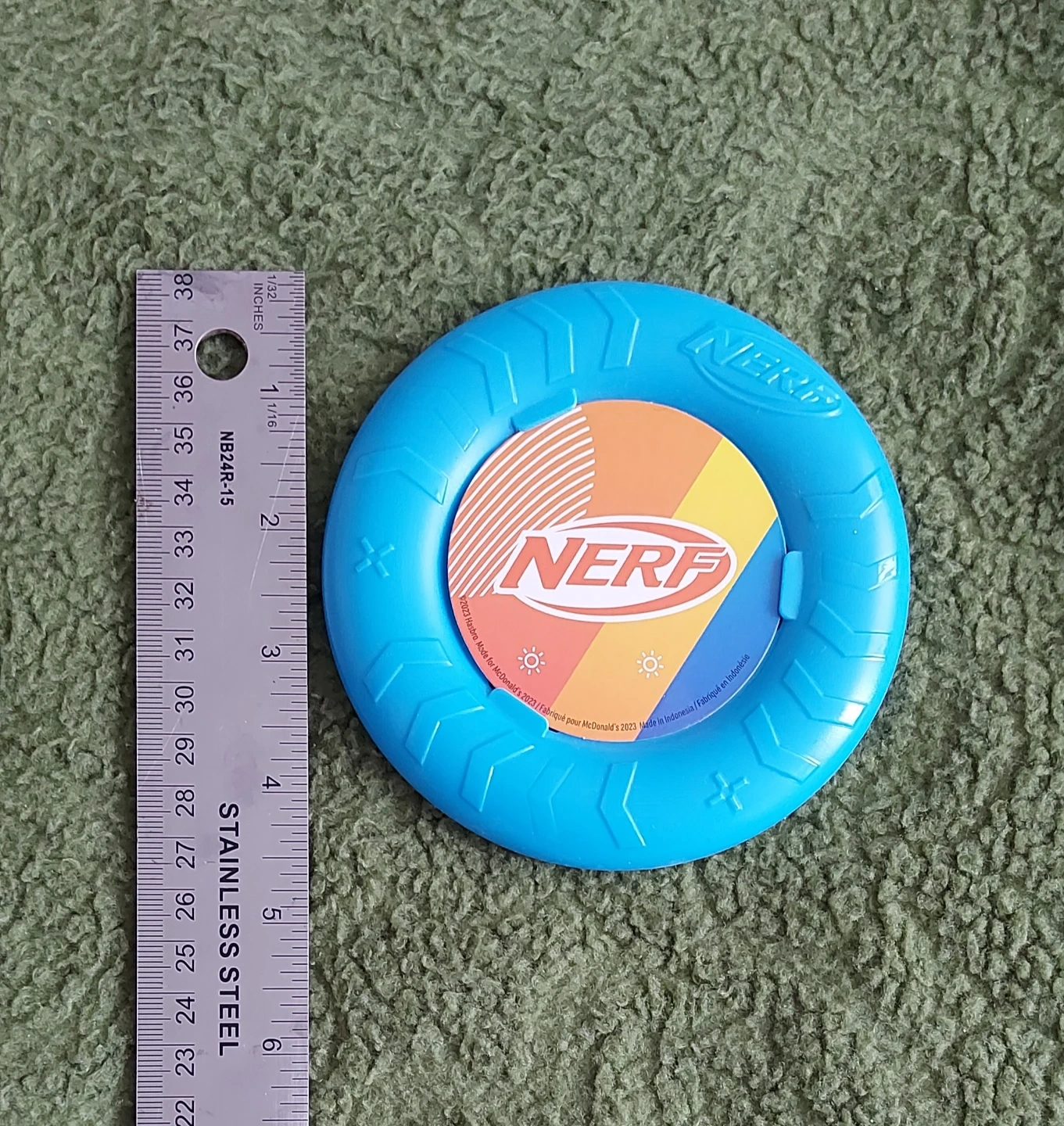 Nerf blue flying disc toy from McDonald's 2023. Made in Indonesia. It's blue plastic.