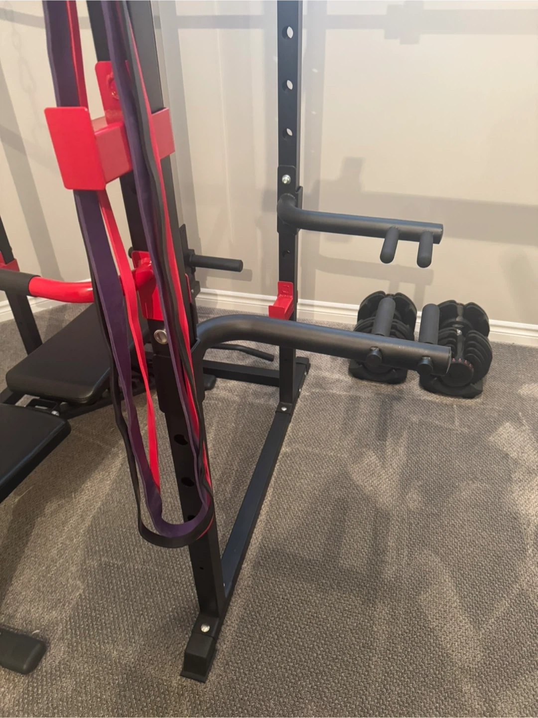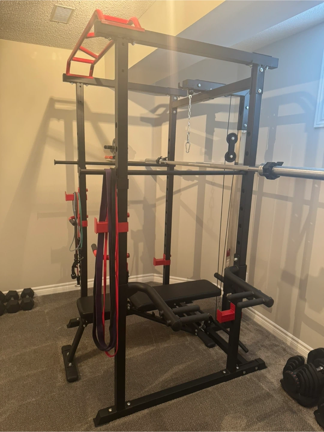 This home power squat rack features a durable metal frame and multiple attachment points. It's suitable for a wide range of strength training exercises.
