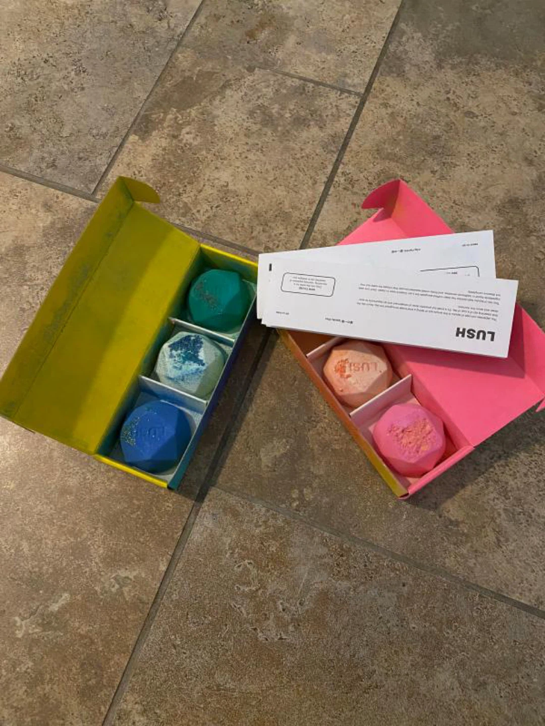 This is a Lush bath bomb gift set with 3 bath bombs. The set includes bath bombs in various colours including blue, green, and pink. It comes with two boxes, one yellow and one pink, and an information card.