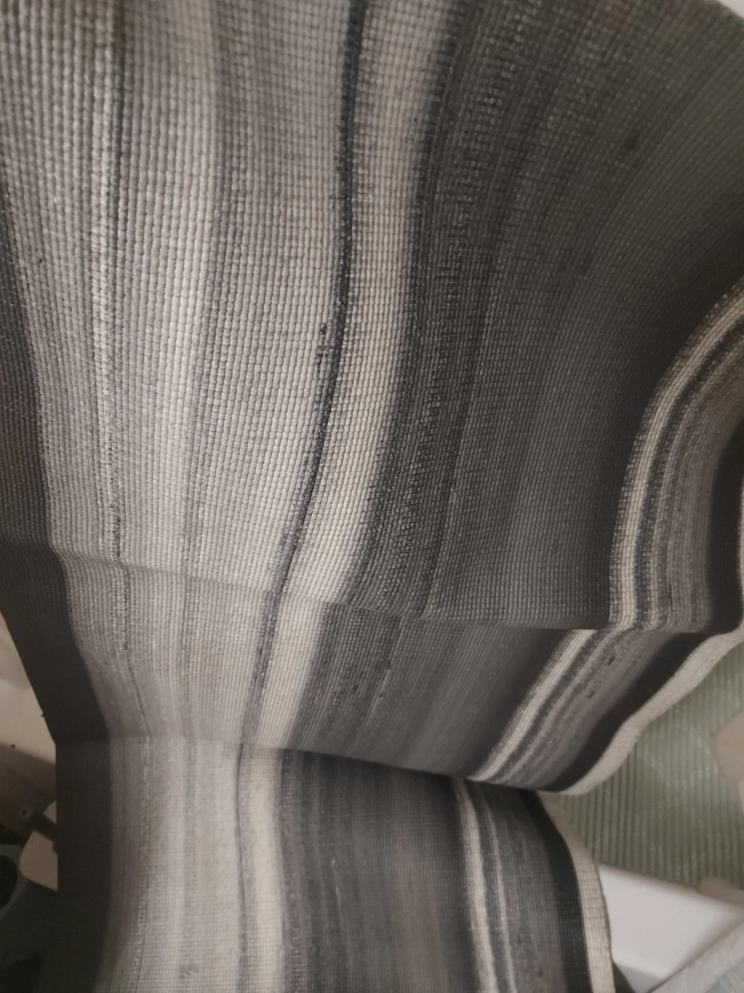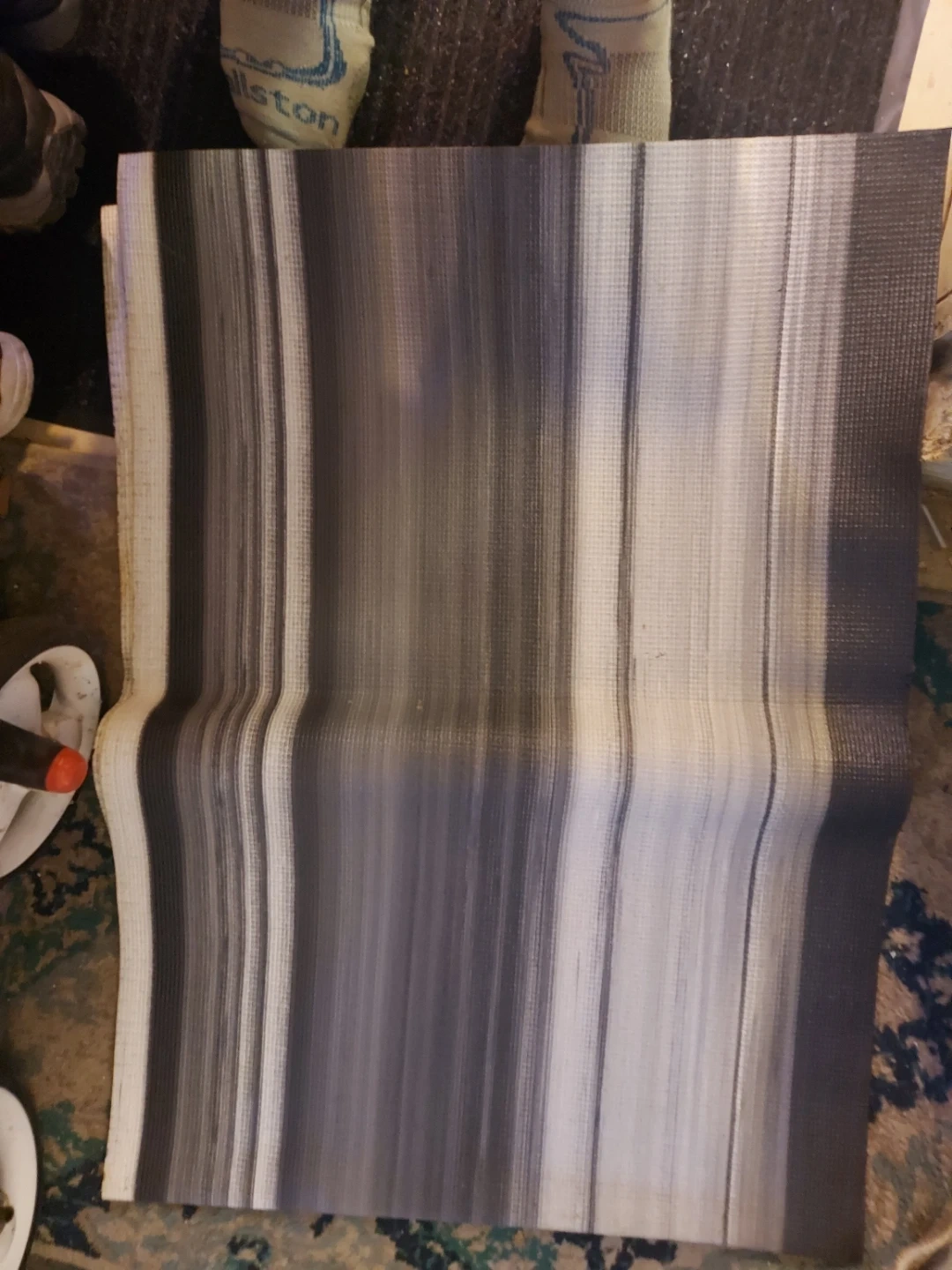 Here's a yoga mat with a striped pattern in shades of gray and white! It's perfect for your home workouts or yoga sessions. It's in great condition and ready for a new owner!