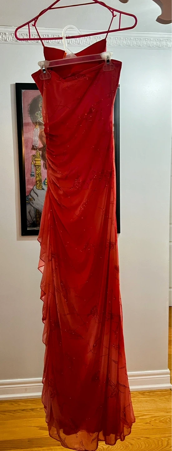 A stunning red formal gown with delicate beading and a gathered, ruffled design. It features spaghetti straps and a flowing silhouette, perfect for any special occasion.