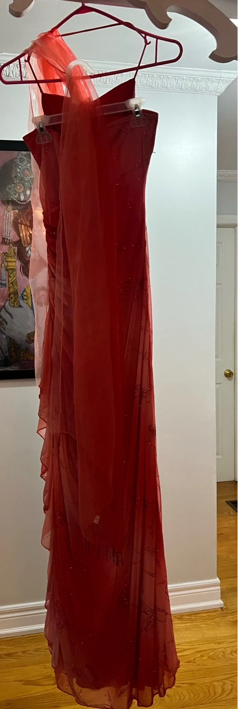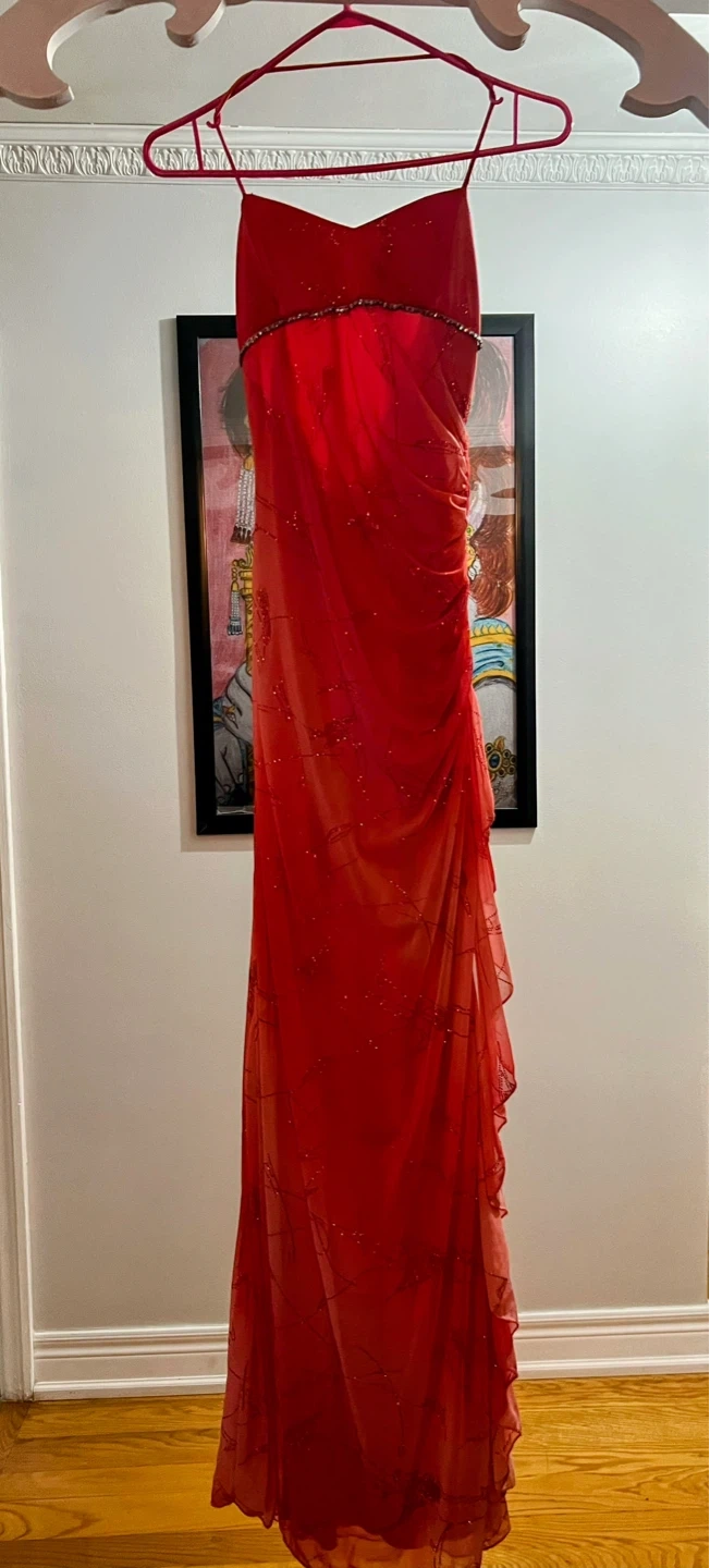 A stunning red formal gown with delicate beading and a gathered, ruffled design. It features spaghetti straps and a flowing silhouette, perfect for any special occasion.