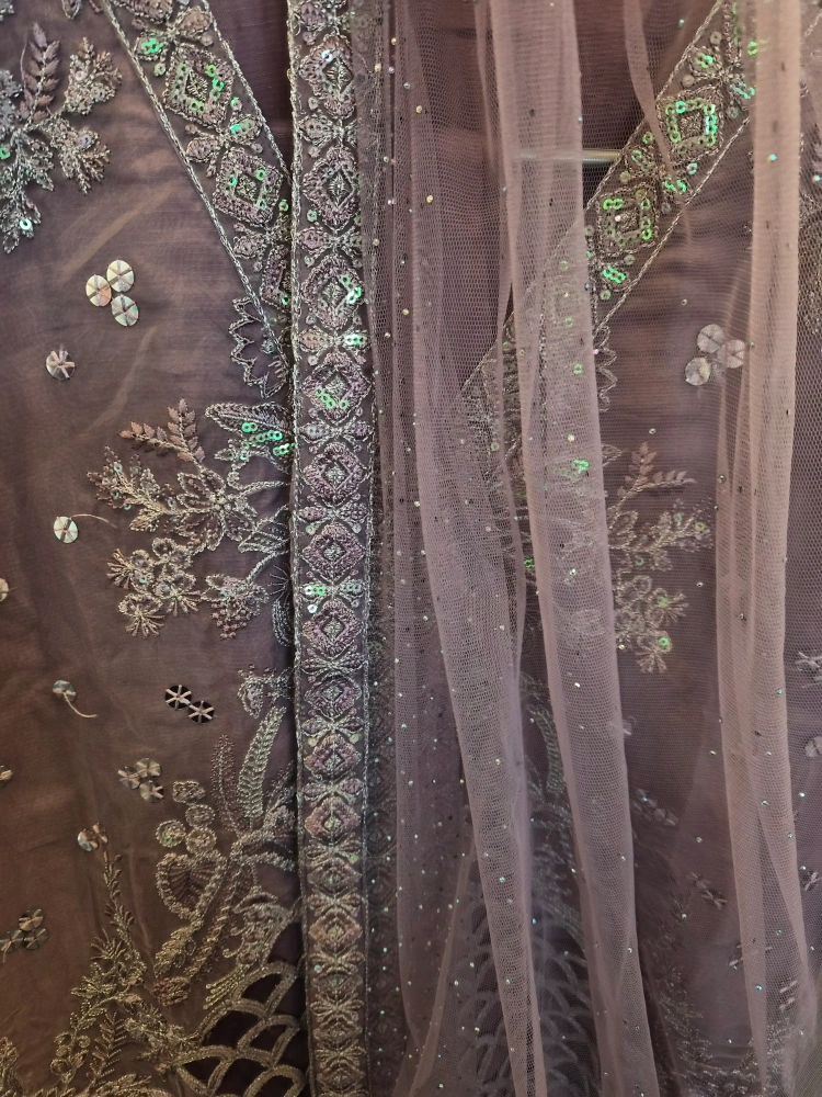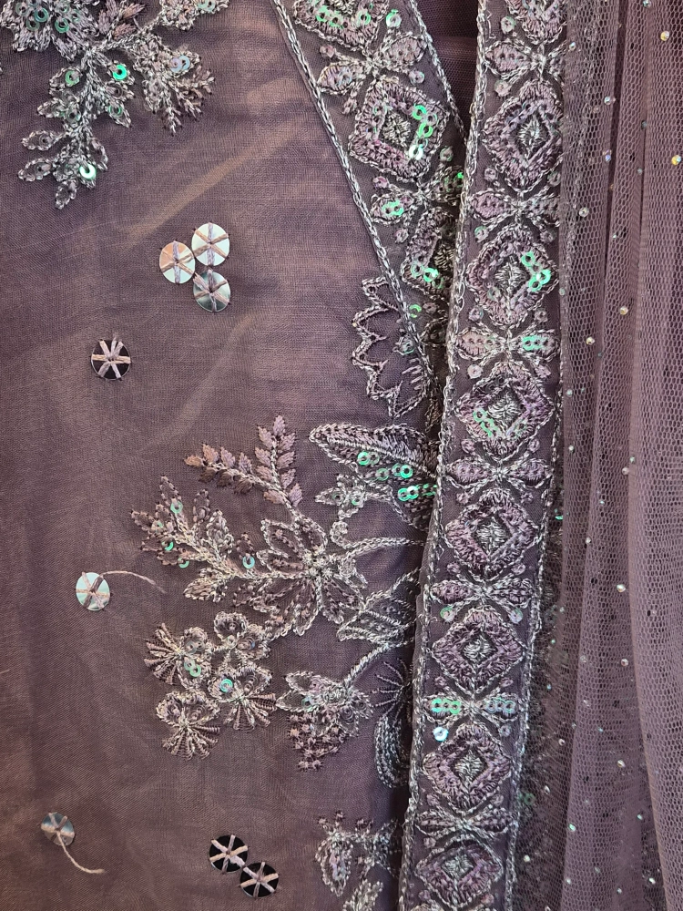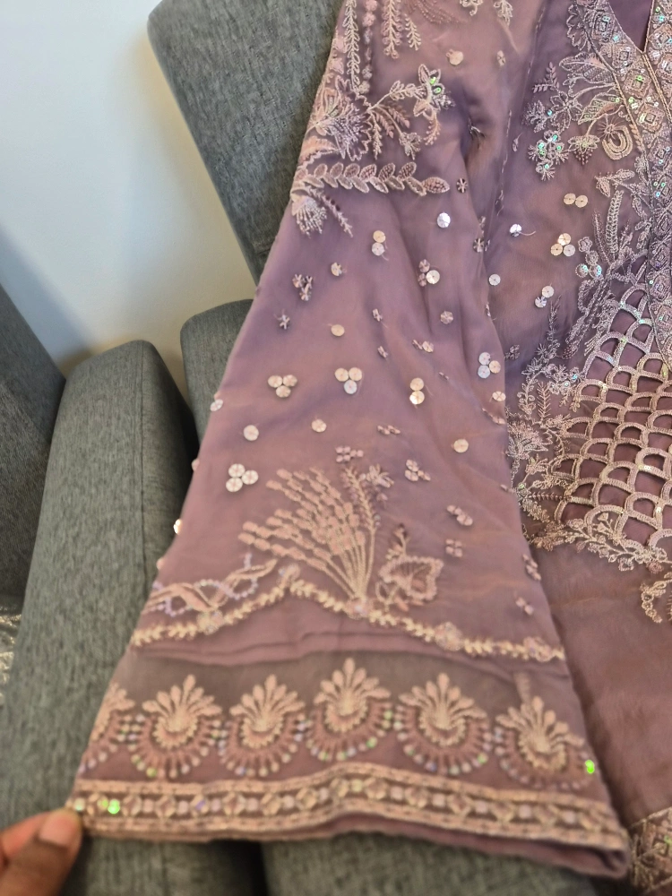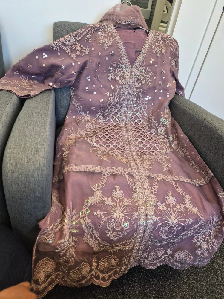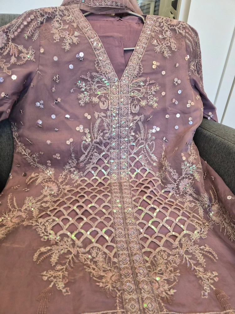 Selling a beautiful mauve coloured shalwar kameez with intricate embroidery and sequin detailing. Perfect for special occasions or festive wear! The fabric is lightweight and flowy, making it comfortable to wear. Comes with a matching dupatta.