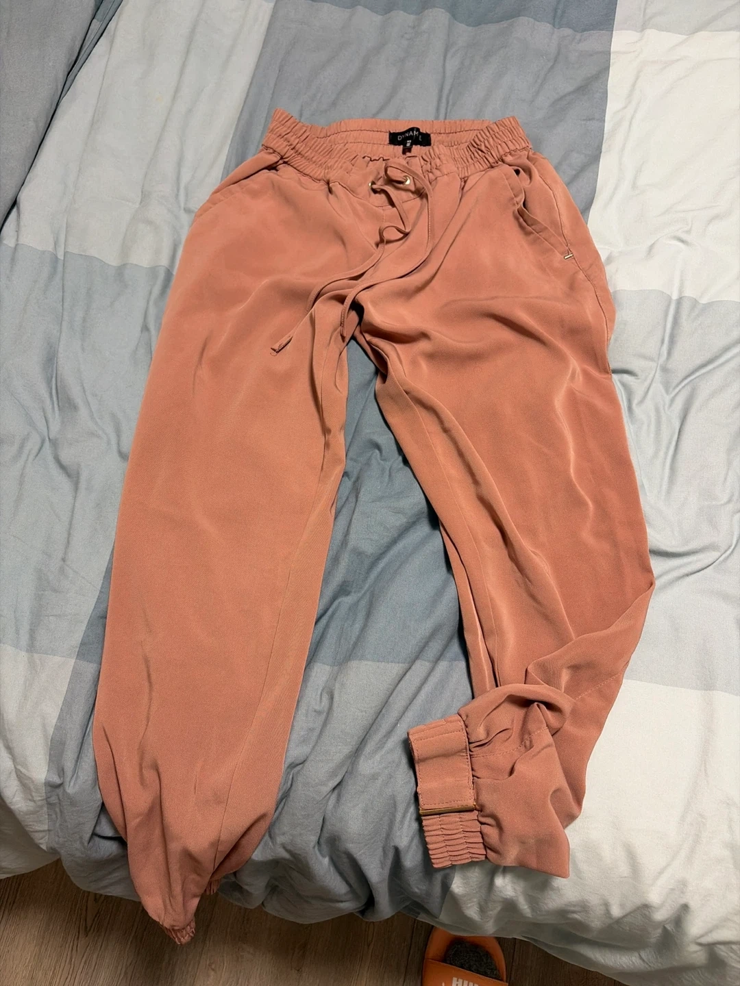 These joggers are a lovely coral pink colour. They're made from a lightweight, flowy material with an elastic waistband and drawstring. Cuffed ankles feature an adjustable strap.