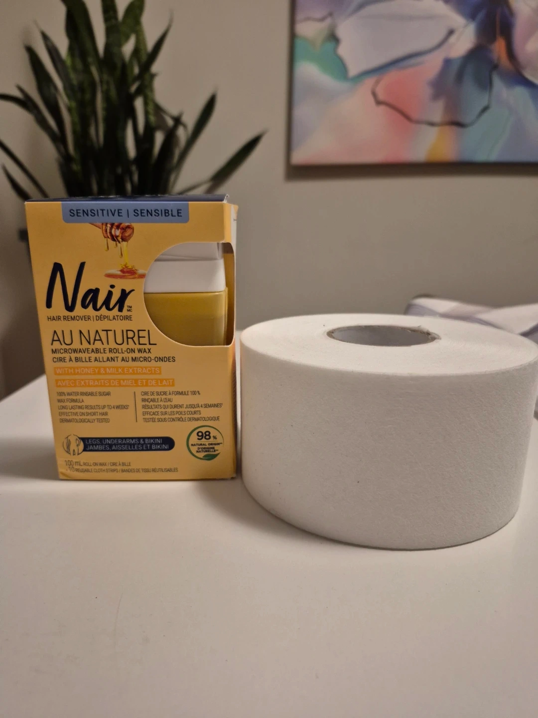 Nair Au Naturel microwavable roll-on wax kit for hair removal. Both the wax package and the wax strip roll are for sale.