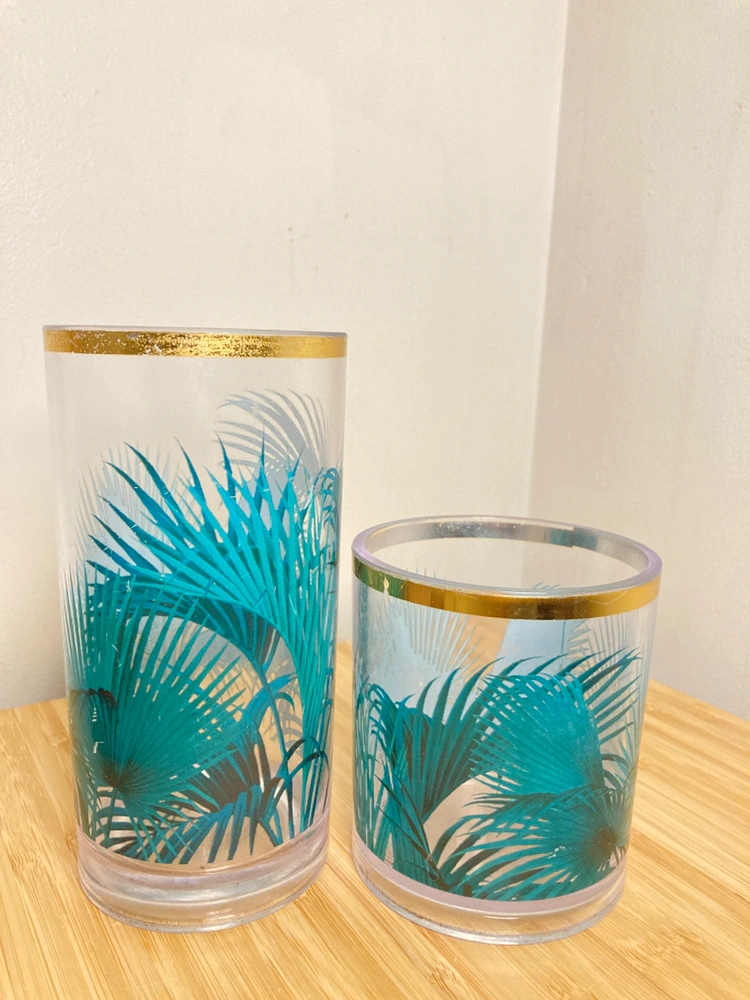 A pair of plastic cups from H&M Home with cute tropical plants decal. Tall holds 500 ml, short holds 250 ml. Decal is a little scuffed but otherwise fine. No cracks or chips.