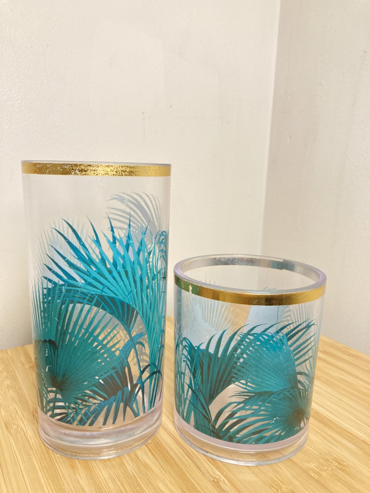 A pair of plastic cups from H&M Home with cute tropical plants decal. Tall holds 500 ml, short holds 250 ml. Decal is a little scuffed but otherwise fine. No cracks or chips.
