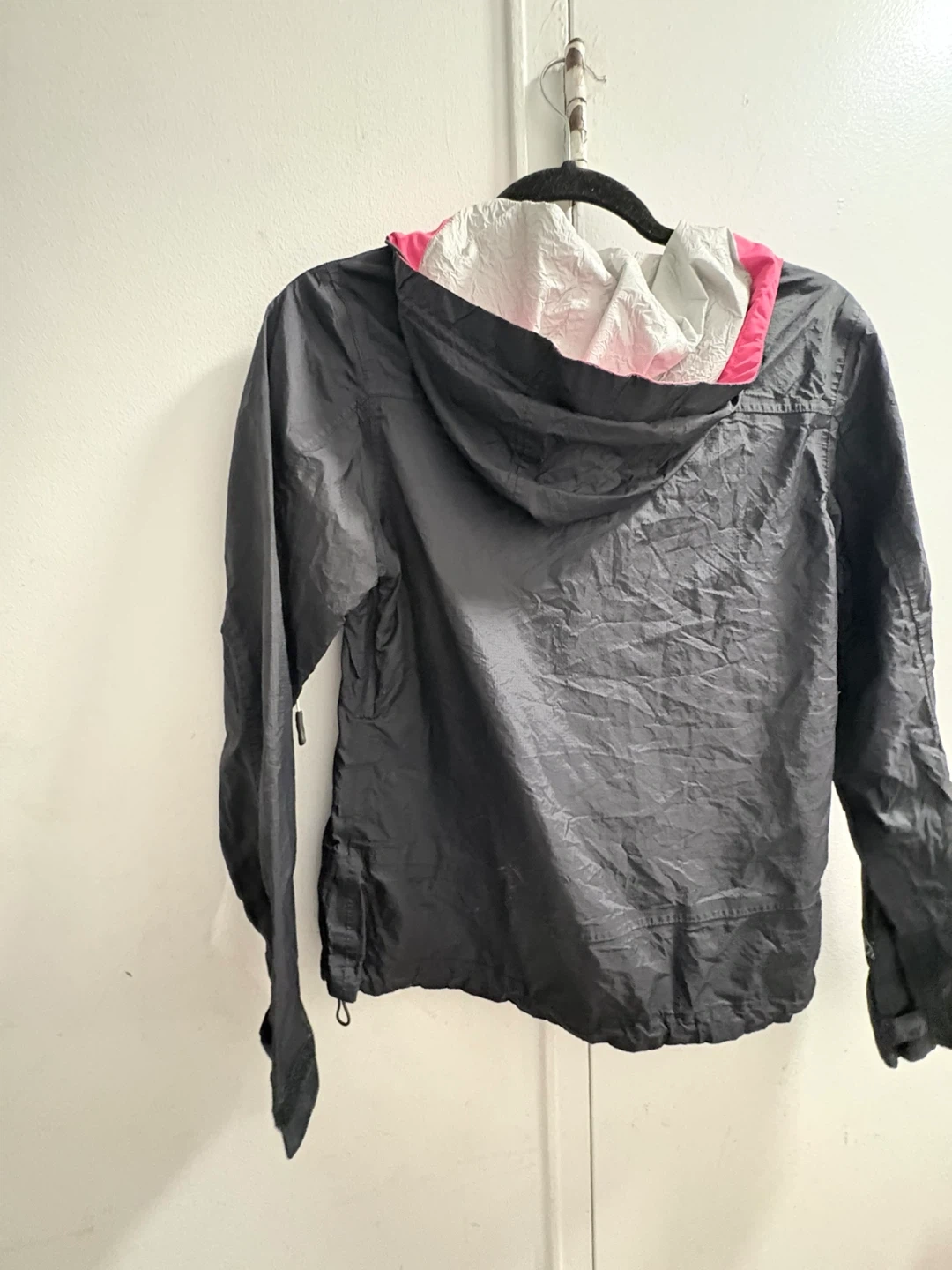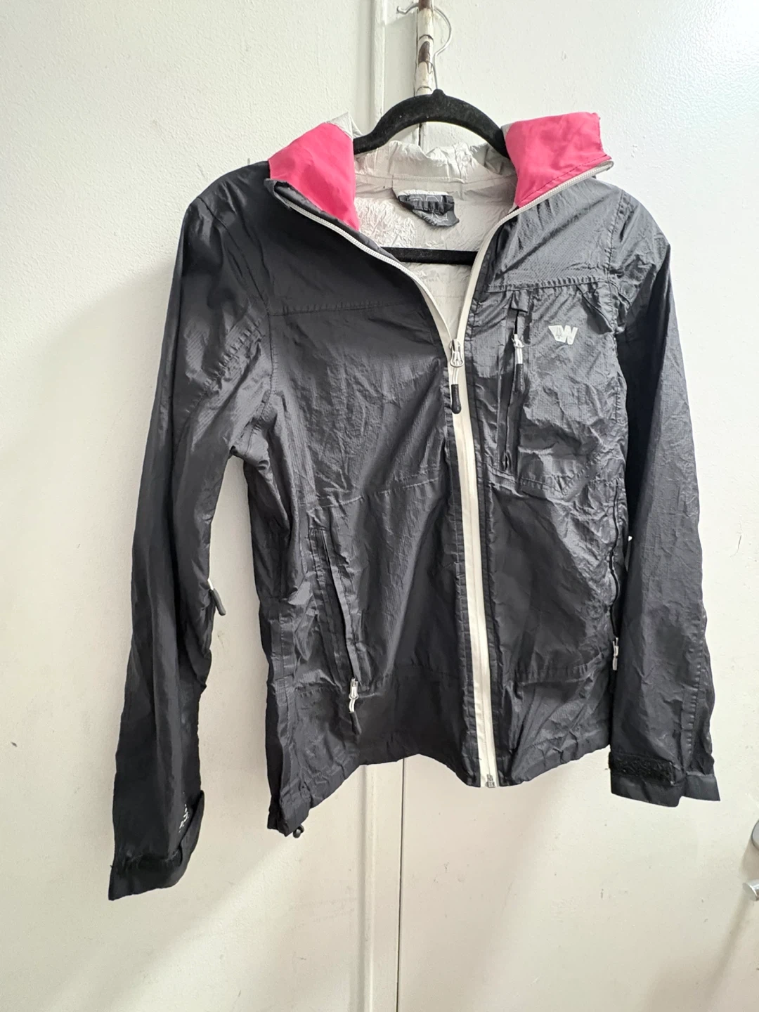 Black W.W. sport jacket with a pink and gray lined hood. It's lightweight and water-resistant. Features a full zip front and zippered pockets.