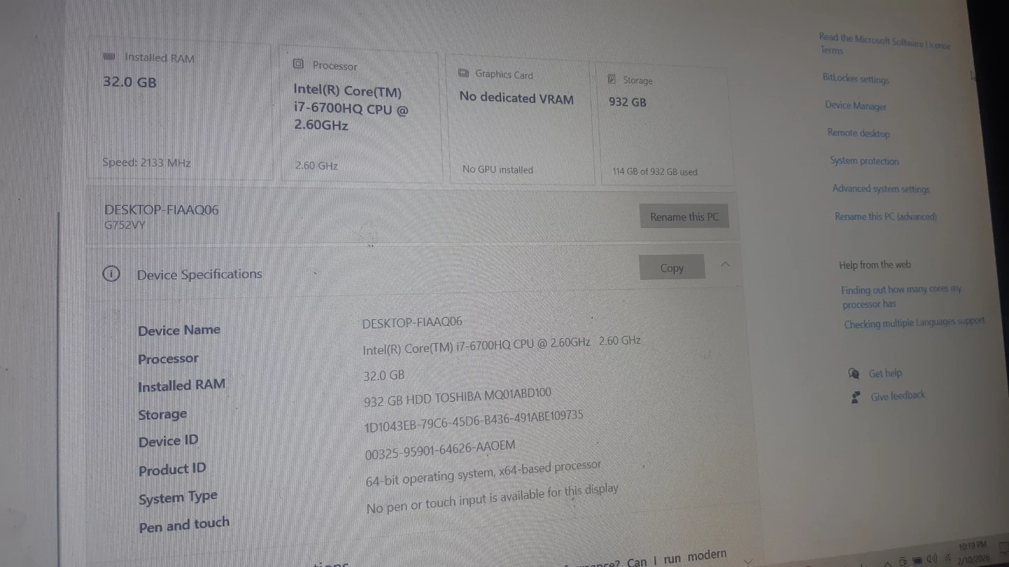 This laptop p computer features an Intel Core(TM) i7-6700HQ CPU running at 2.60GHz. It comes with 32.0 GB of installed RAM and 932 GB of storage. No dedicated VRAM is present, and it has no pen or touch input.