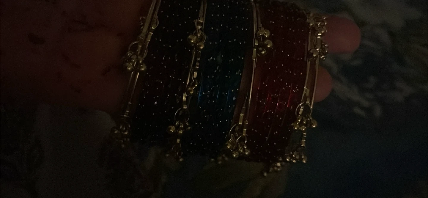 Set of three bangles in red, blue, and deep red/maroon colours. Each bangle features small gold-toned charms that jingle. These are made of a beaded material with a metal frame. Comes in a plastic container.