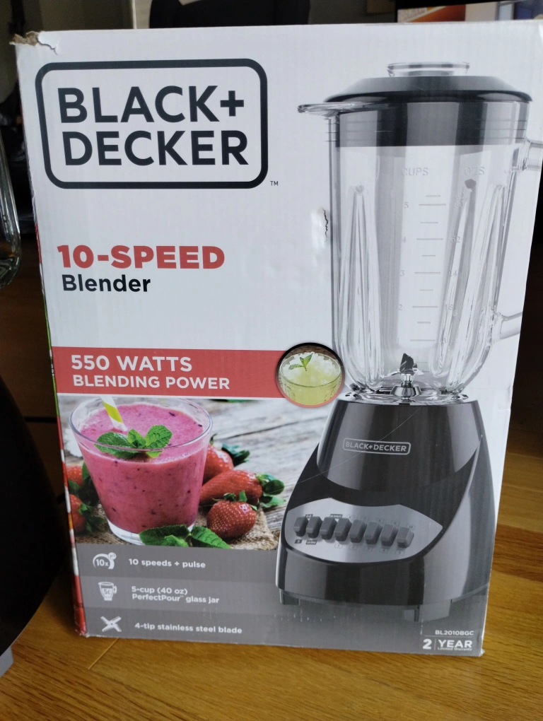 Selling a Black+Decker 10-speed blender! It has a 550 watts blending power and a PerfectPour 5-cup (40 oz) glass jar. It also features a 4-tip stainless steel blade. This blender is perfect for making smoothies and other blended drinks. Instruction booklet included.