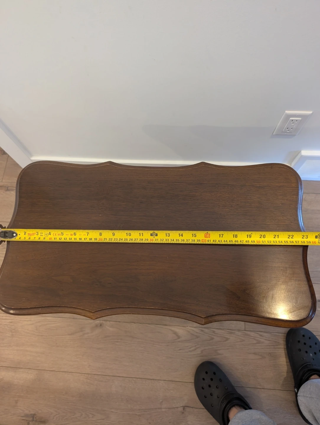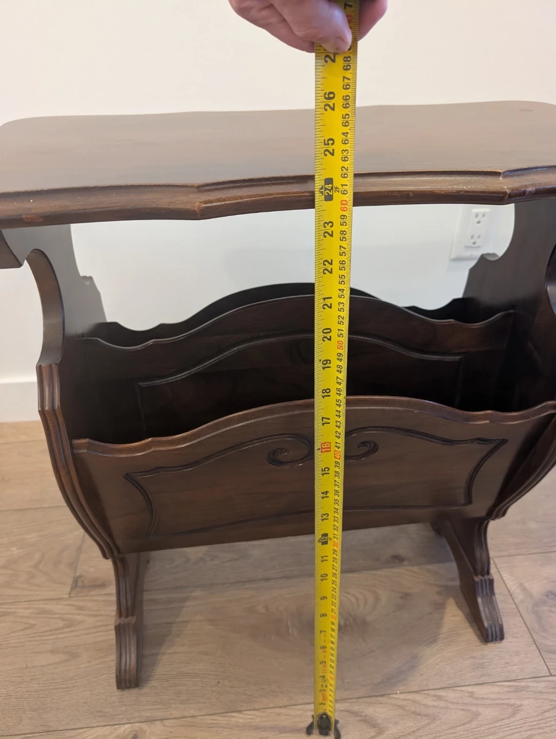 A dark wood magazine rack with a table top. It's approximately 16 inches wide and 23 inches tall. The design includes decorative carvings on the front panel.