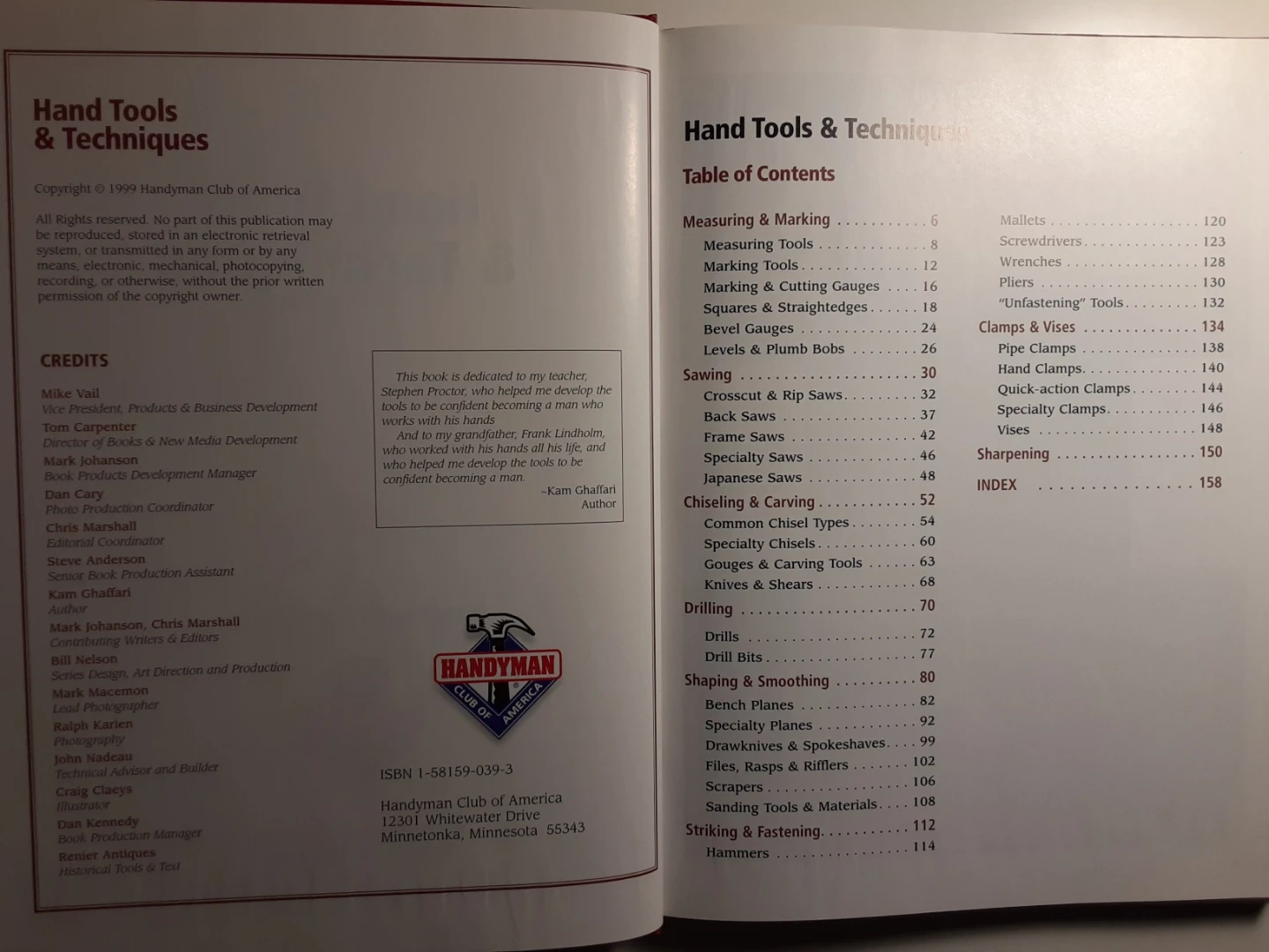 This is the "Hand Tools & Techniques" book from the Handyman Club of America. It covers various tools and methods for woodworking and is a great resource/collectible for hobbyists and professionals alike!