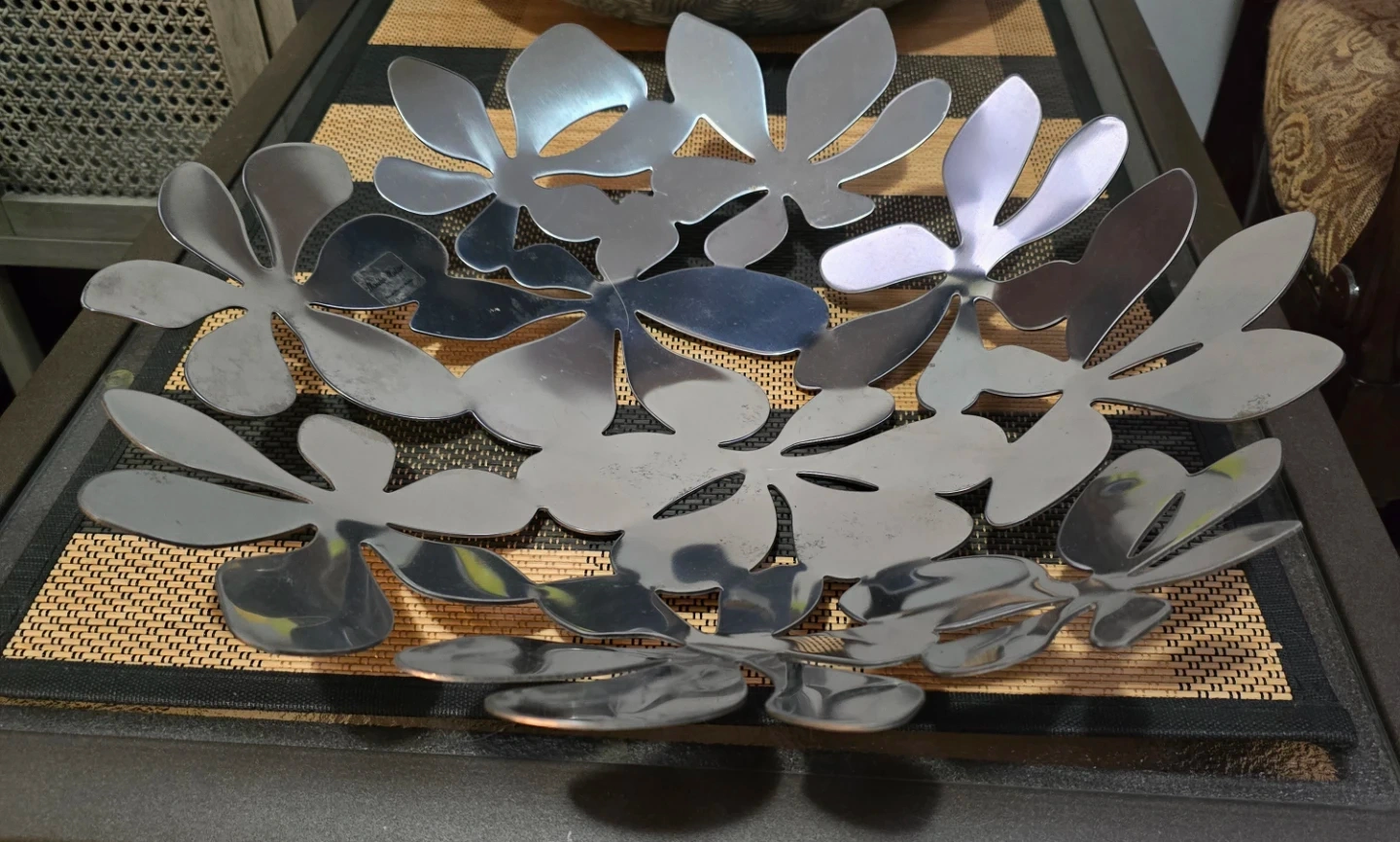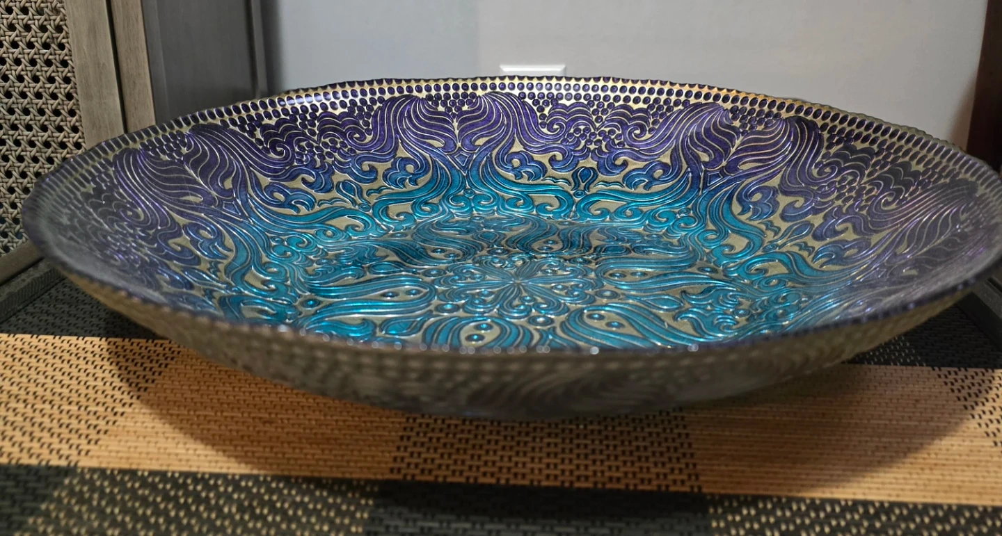 This is a beautiful glass bowl with an intricate mandala-like pattern in shades of blue and purple, accented with gold. It's perfect for displaying on a table or shelf as a decorative piece. Made of glass.
