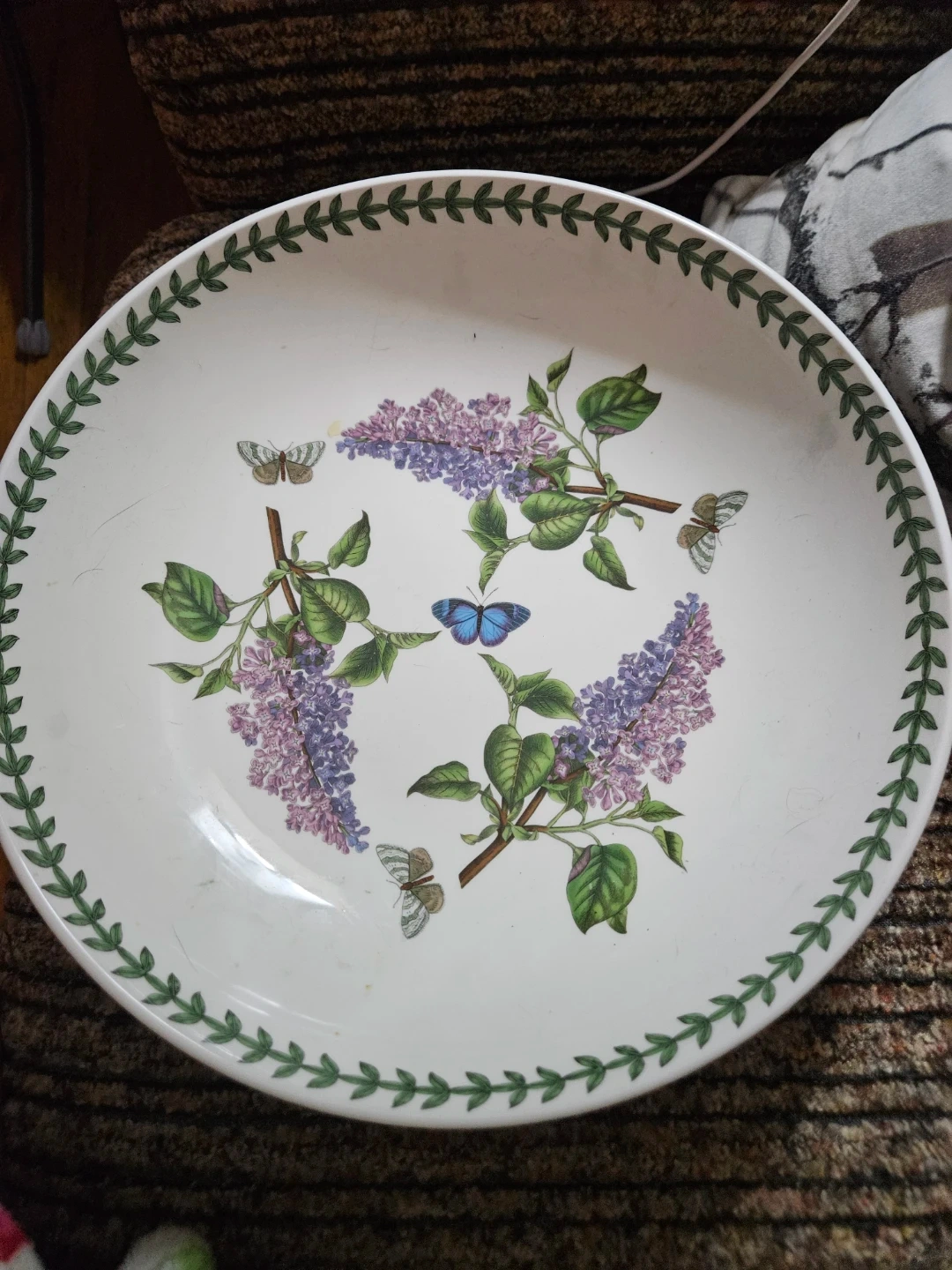 This is a Portmeirion Botanic Garden large plate featuring a butterfly and lilac design. It's made in England and is dishwasher, microwave, and freezer safe. Measures approximately 10.5 inches in diameter.