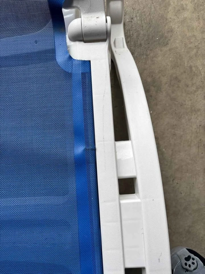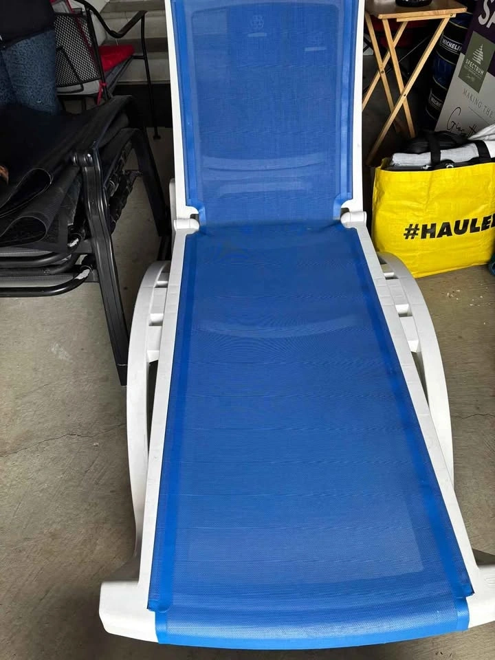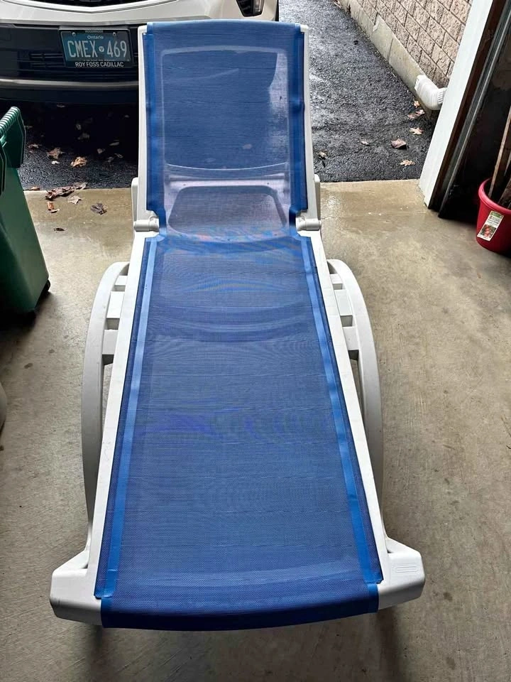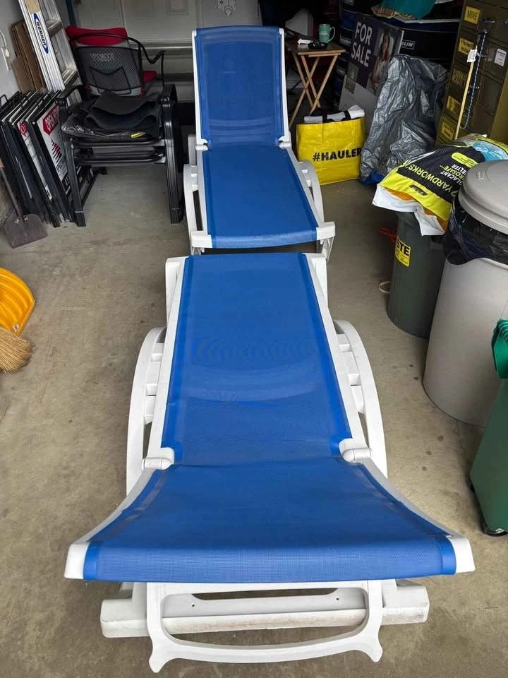 Comfortable outdoor patio lounge chairs in great condition. Adjustable backrest so you can sit up or fully recline. Sturdy white frame with breathable blue mesh fabric — perfect for backyard, patio, or poolside use. No structural issues. Some light cosmetic wear from normal use (see photos), but overall very solid and ready to go. Selling as a pair. Features adjustable reclining positions (4 positions), durable plastic frame, breathable mesh material, easy to clean, and outdoor-ready. Pick up only.