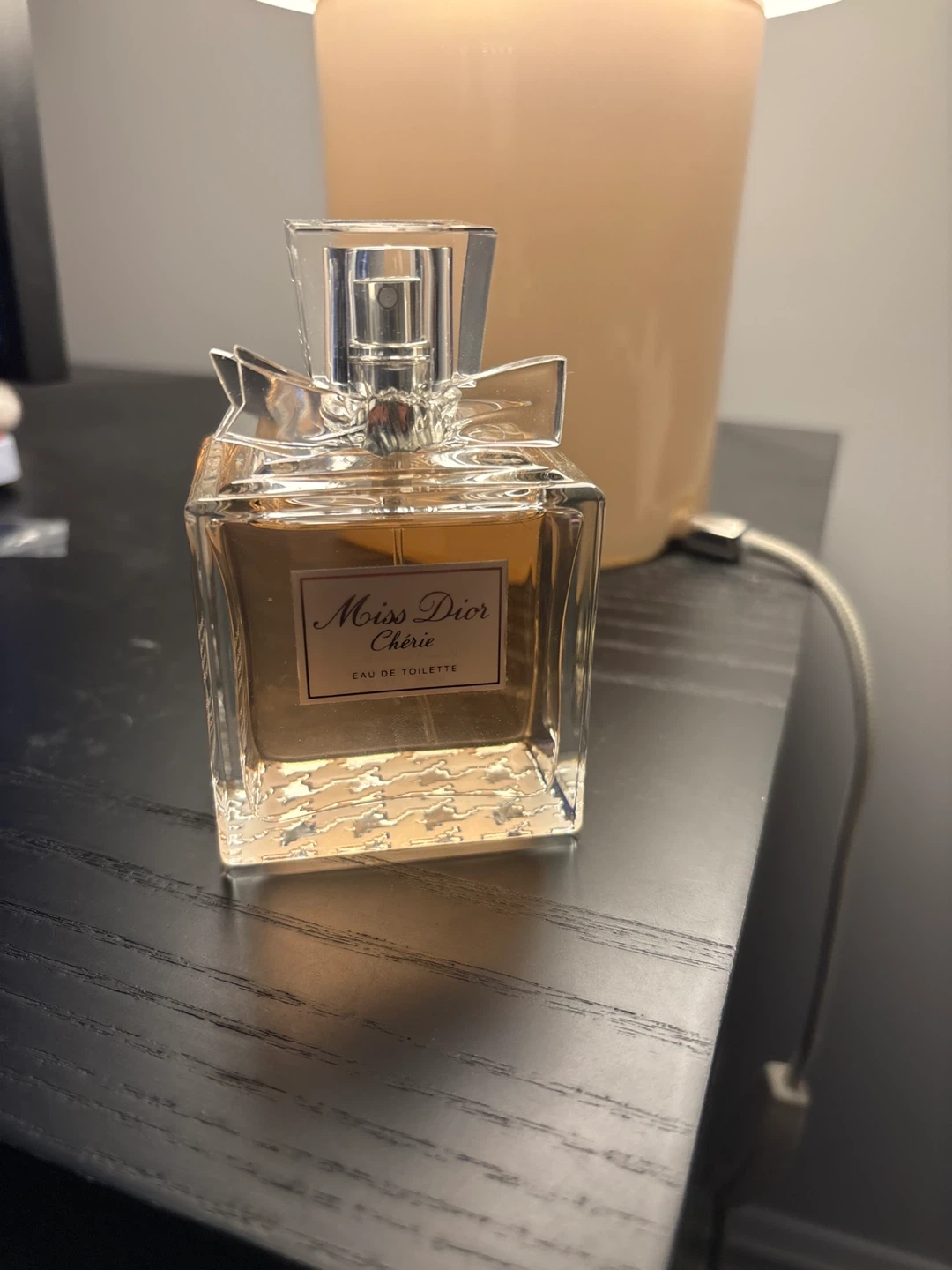 Miss Dior Chérie Eau de Toilette perfume bottle. Features a clear glass bottle with a decorative bow detail on the cap. A lovely fresh floral scent for everyday wear.