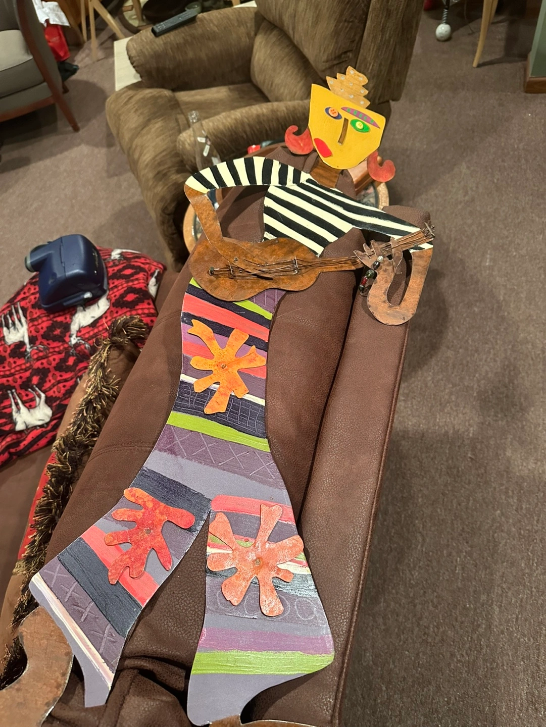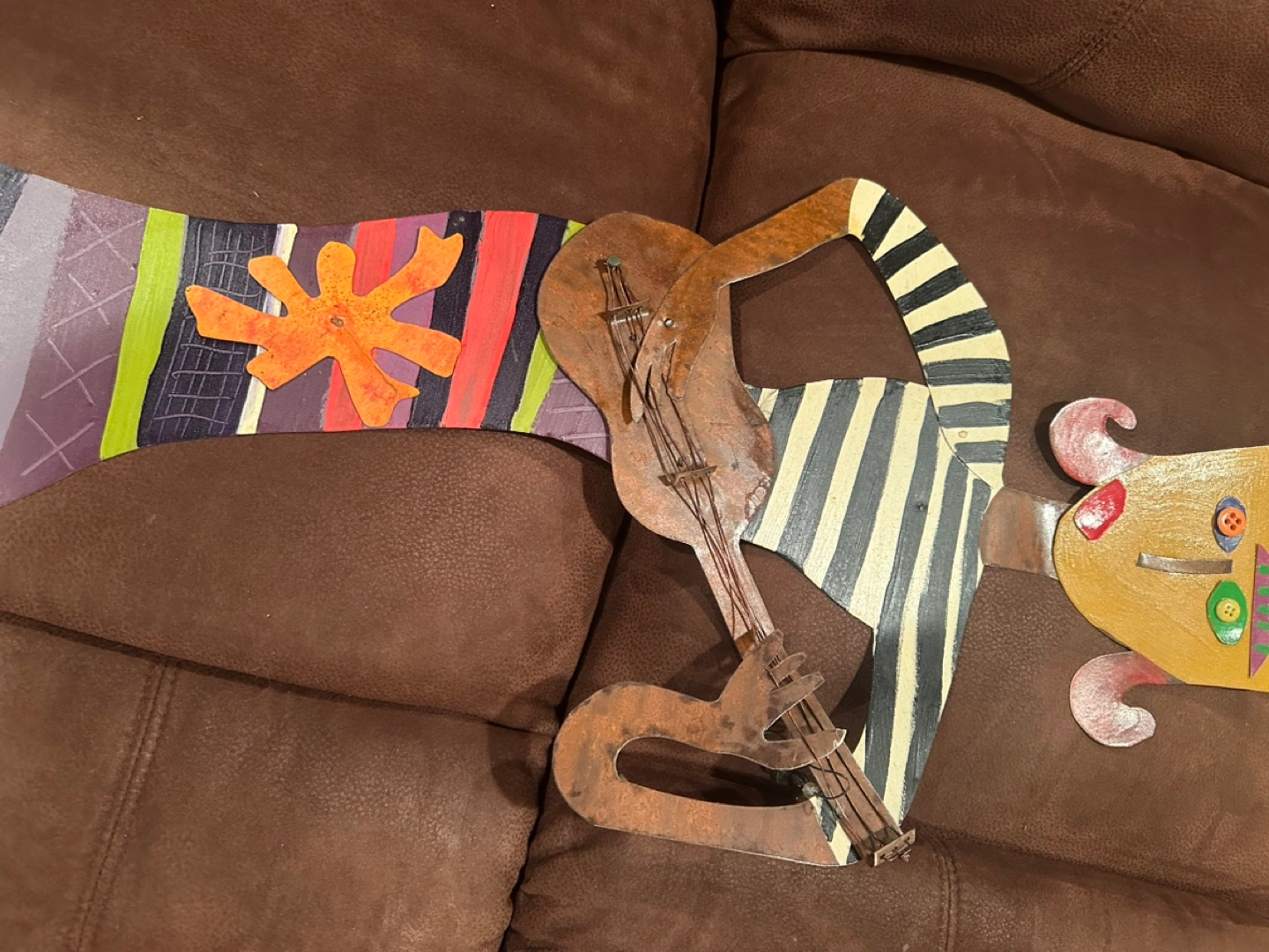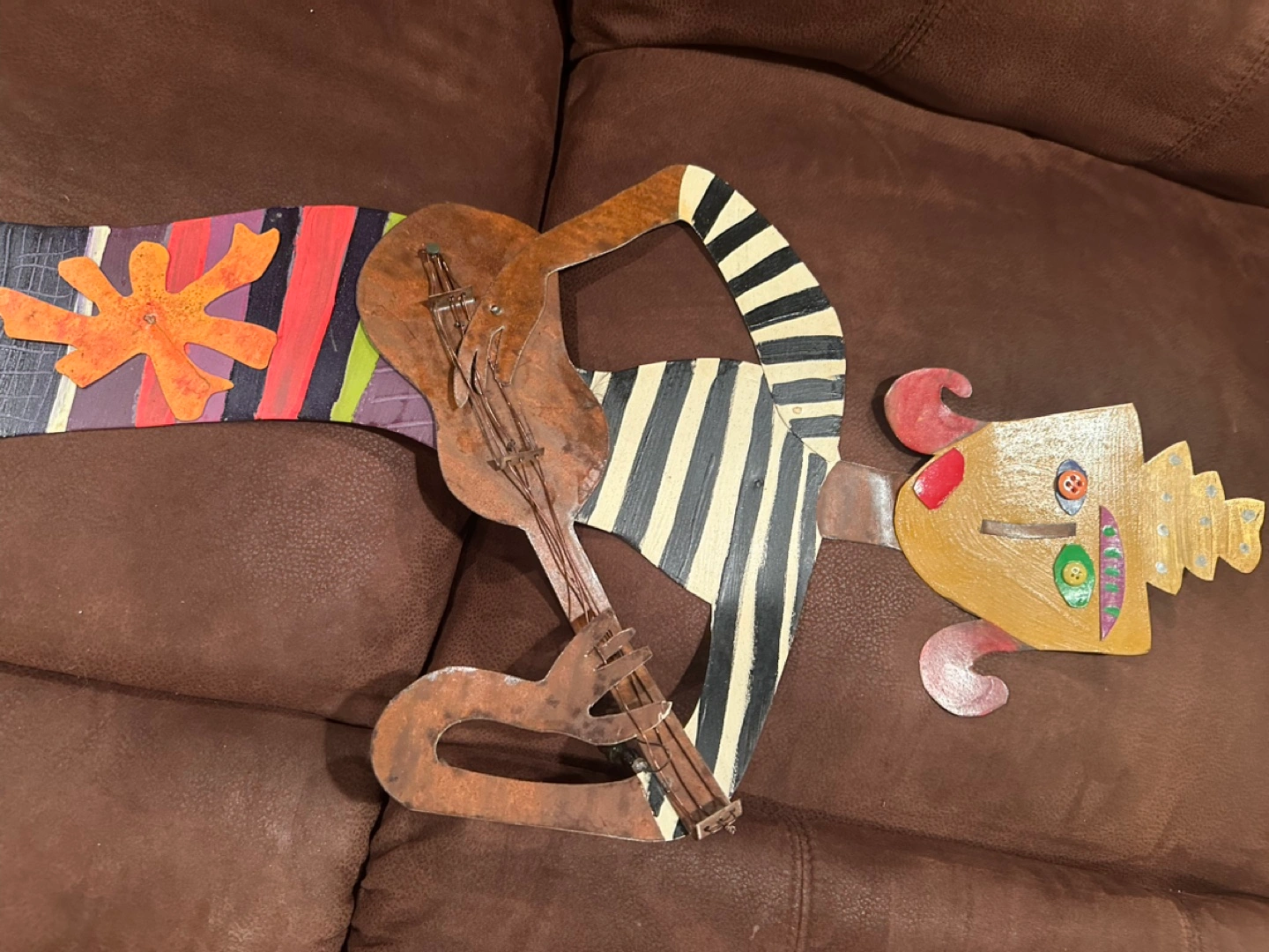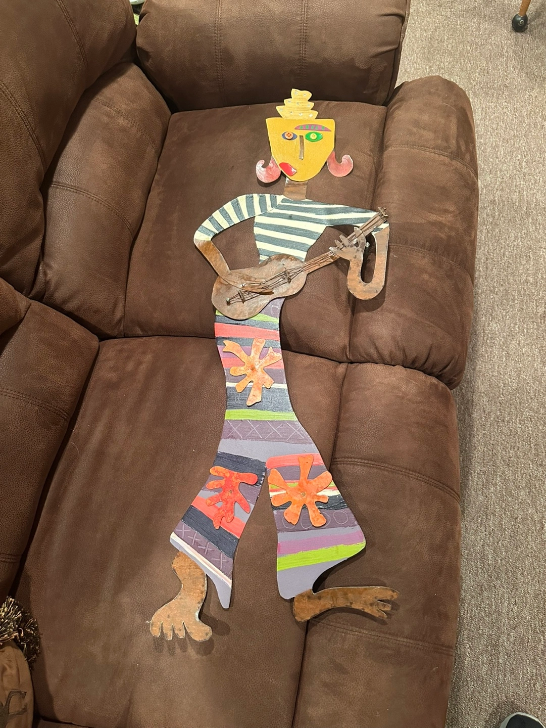 Unique metal wall art. Features a whimsical figure playing a guitar. Colorful design. Great for adding character to any space.