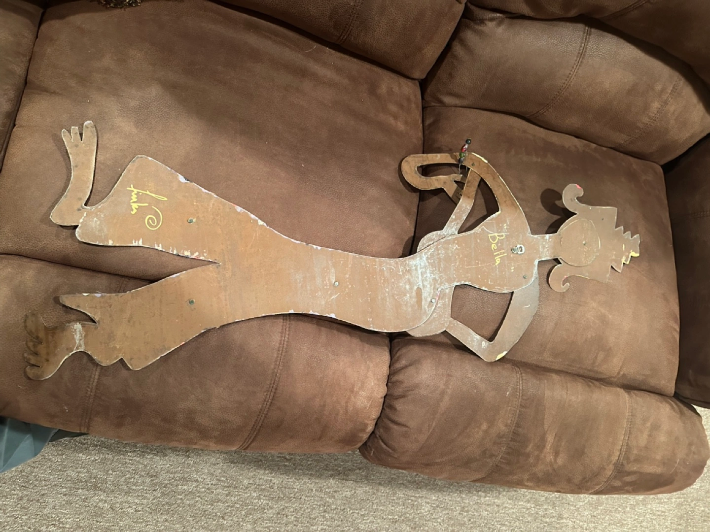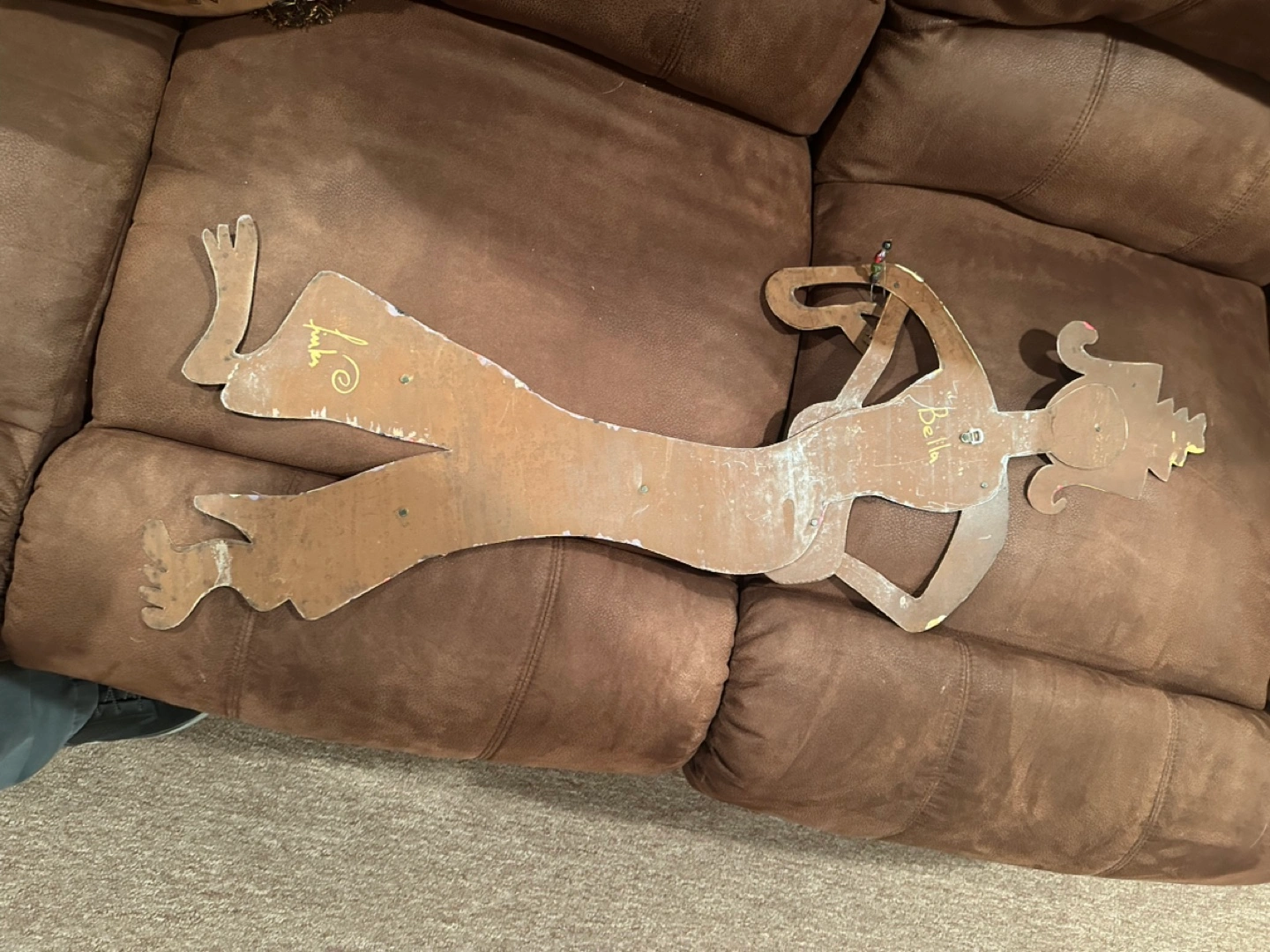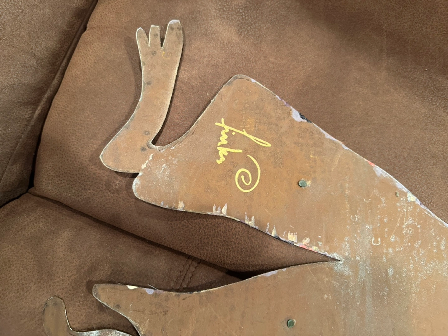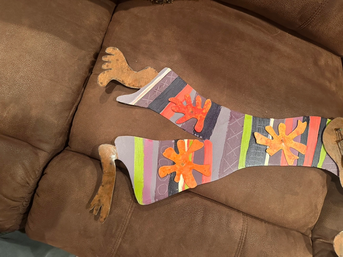 Unique metal wall art. Features a whimsical figure playing a guitar. Colorful design. Great for adding character to any space.