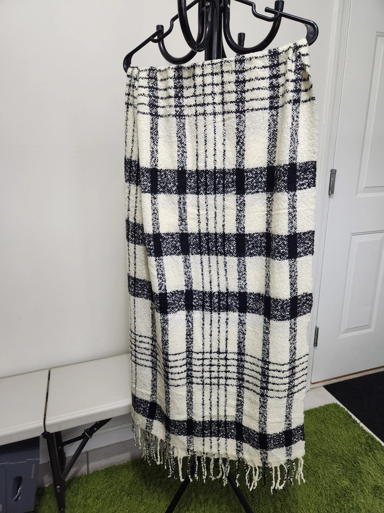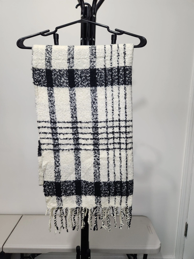 Black and white plaid blanket scarf with fringe. Soft, cozy and very warm. This pre-loved scarf needs a new owner. Very good quality. I have more scarves and other items from my listing.