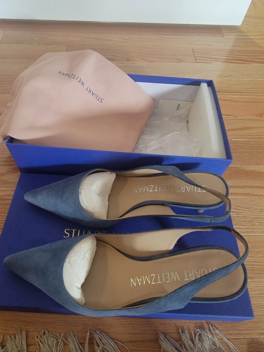 Stuart Weitzman blue suede slingback heels. These stylish shoes are made with a pointed toe and delicate slingback straps. They come in the original box with a dust bag.