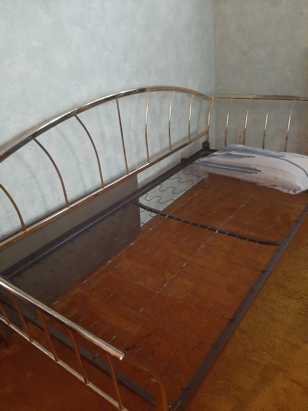 Gold metal daybed frame with a white mattress included. This frame is a great space-saver and can be used as a sofa or a bed. It's made of durable metal and has a decorative headboard and footboard.