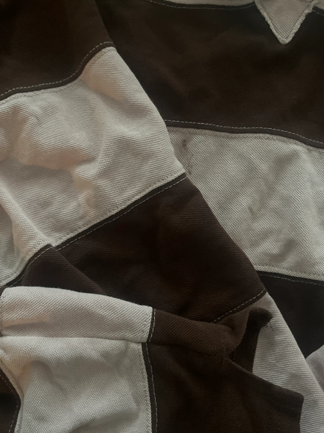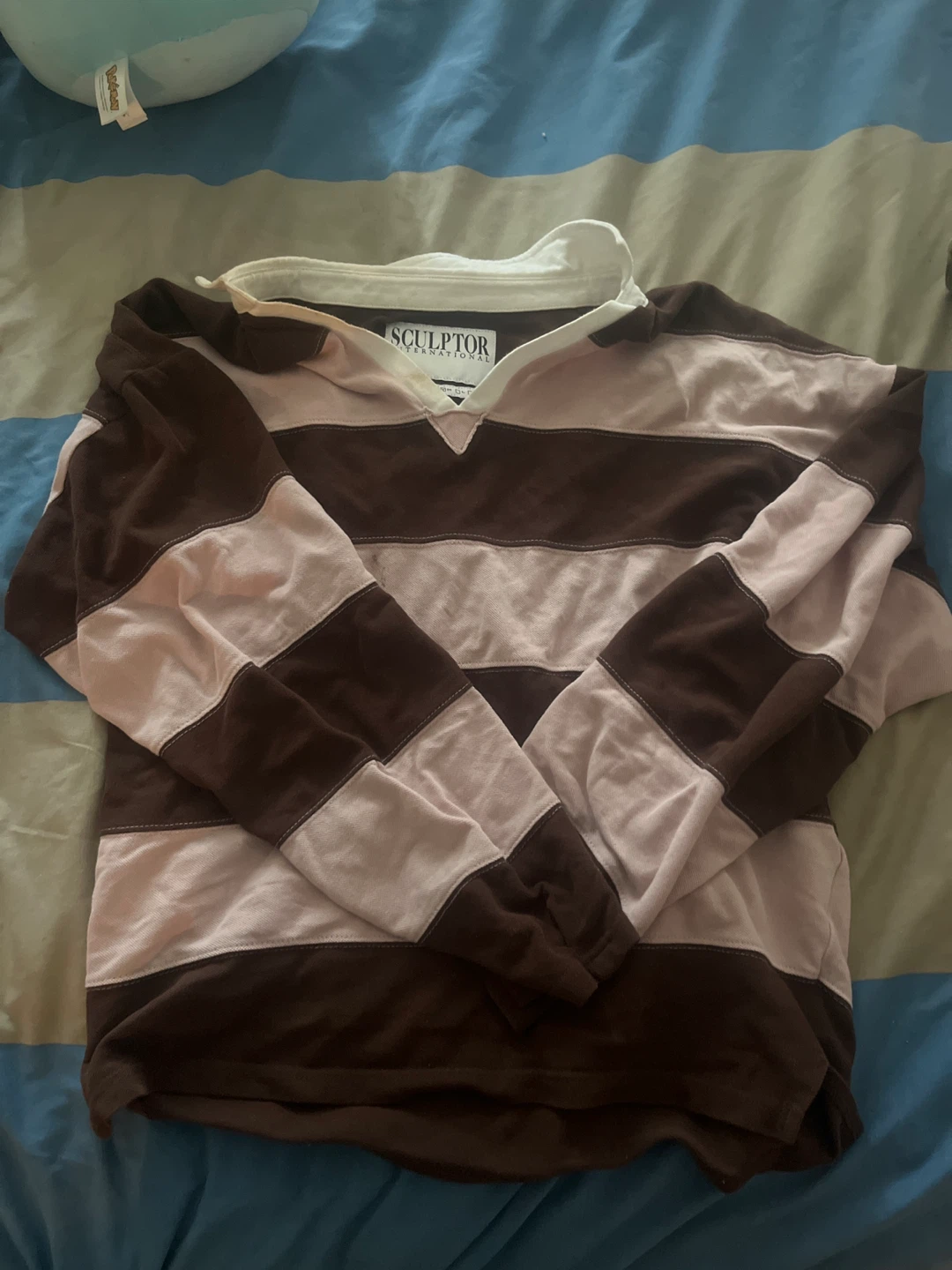Selling a cute Rugby Striped Polo Jersey from Sculptor! It's a size M and features a stylish pink and brown colour palette. Perfect for adding a touch of sporty chic to your wardrobe.